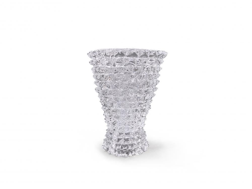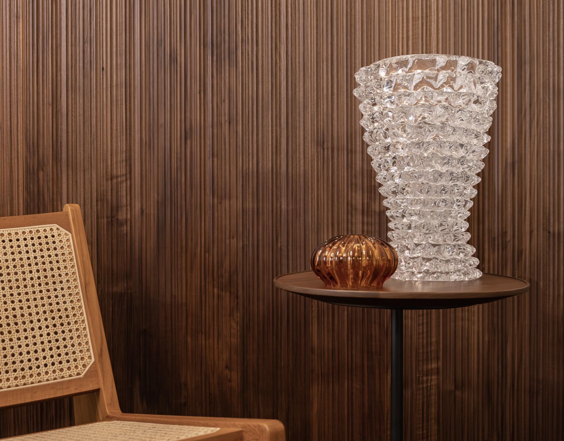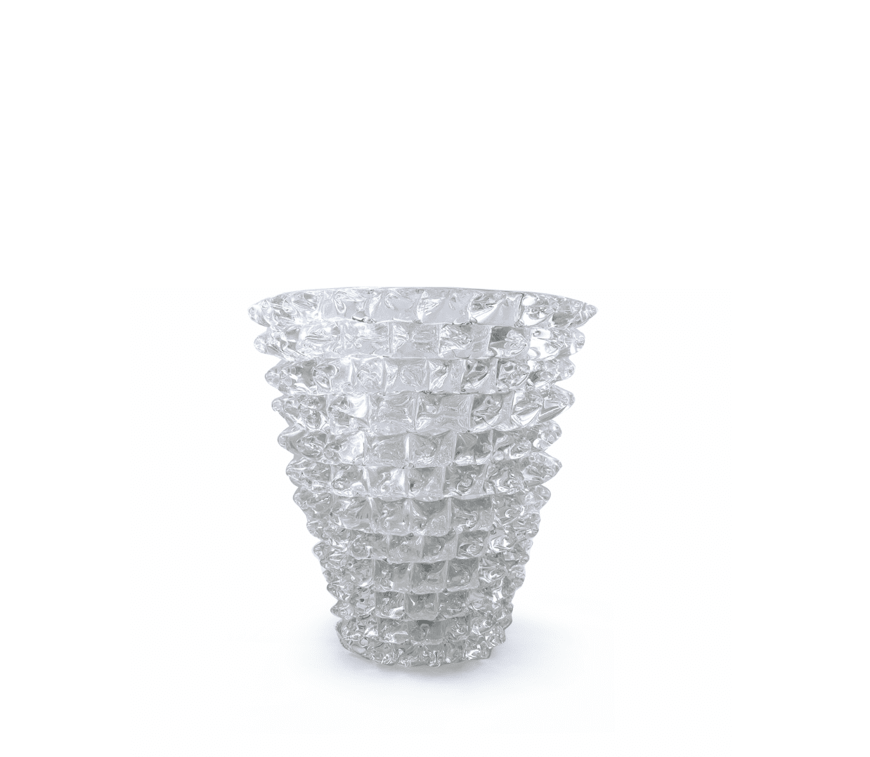 Il vaso Ercole incarna l’apice dell’arte vetraria muranese, fondendo tradizione e innovazione in un’unica opera straordinaria. Nato da un’idea di Ercole Barovier degli anni ’40 e realizzato con la tecnica rivoluzionaria del “rostrato”, brevettata da Barovier&Toso negli anni ’30, questo vaso si distingue per la sua superficie ricca di rilievi e sporgenze. Durante lo stato fuso, il maestro vetraio dà vita a prismi sfaccettati, evocando l’architettura rinascimentale e la struttura di un diamante. Questa lavorazione meticolosa richiede una grande abilità, rendendo ogni rilievo una testimonianza dell’eccezionale maestria artigianale. La trasparenza del vetro, esaltata dai rilievi del rostrato, conferisce al vaso una lucentezza straordinaria e un effetto visivo unico.