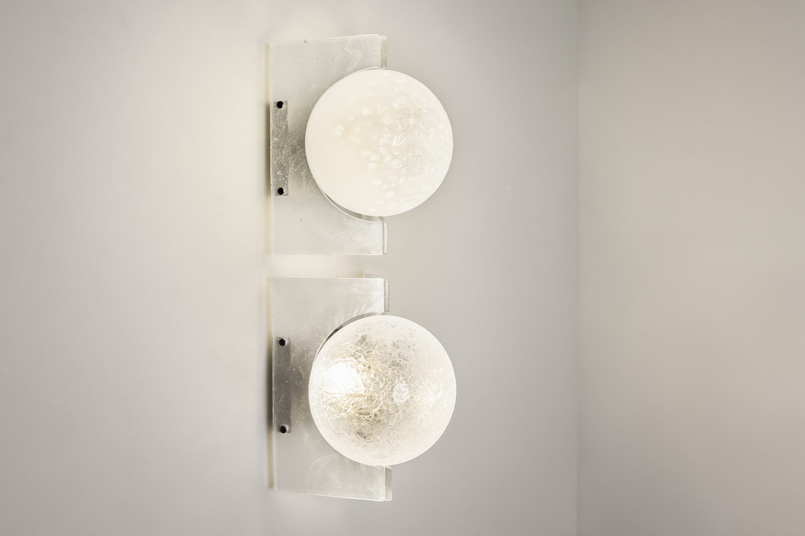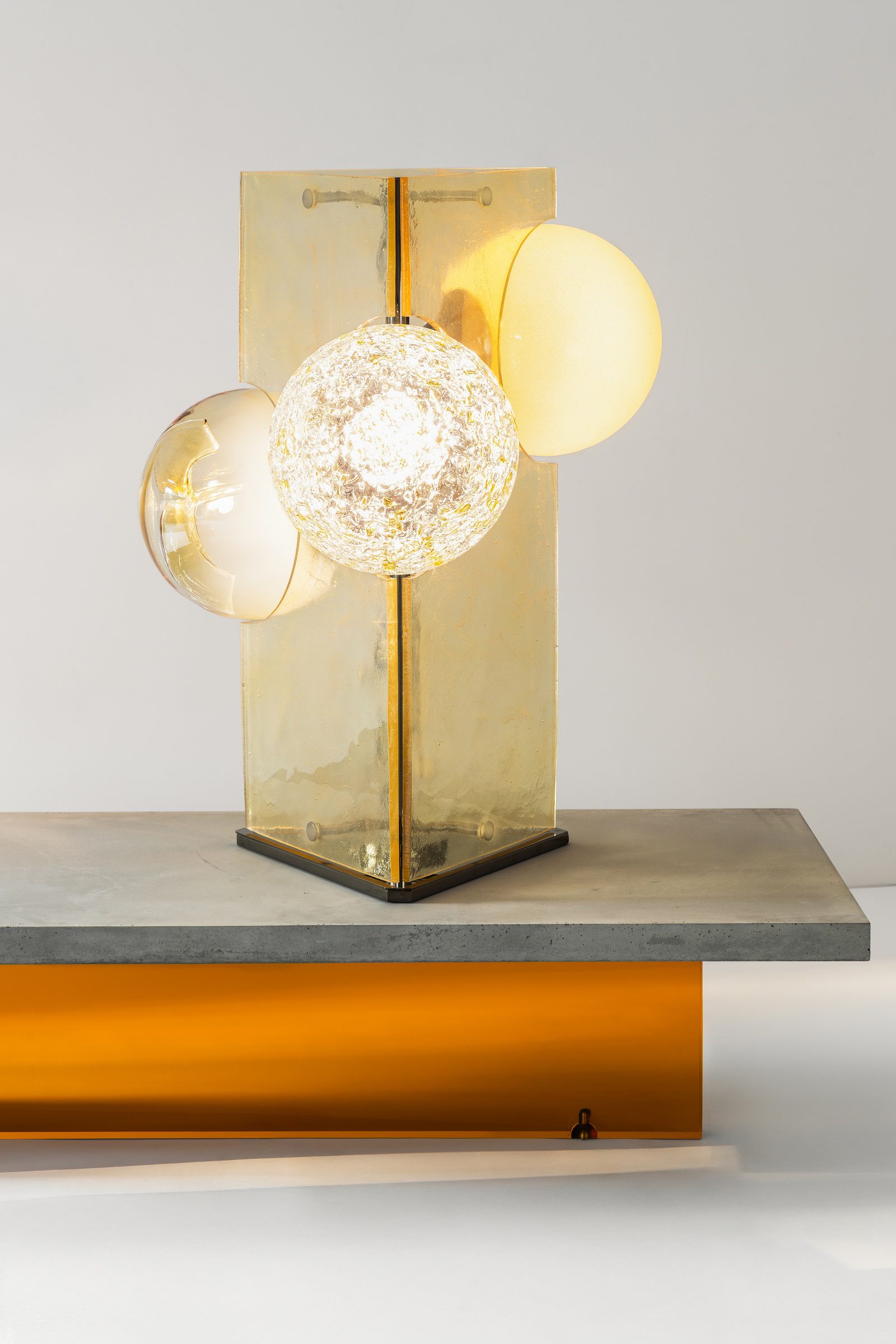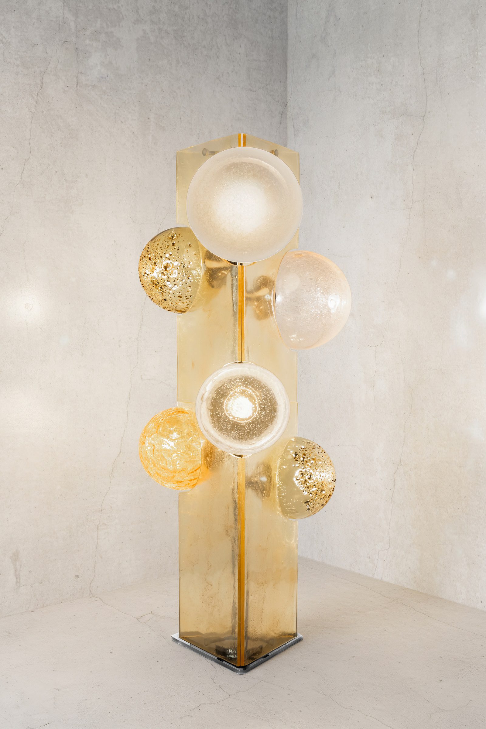 Le lampade Soffio (nelle versioni da terra, a sospensione e applique) rendono omaggio alla tradizione antica dei maestri vetrai dell’isola di Murano, Venezia, e alla loro capacità di trasformare in arte la luce. Ciascuna è un pezzo unico e nasce dalla combinazione di bolle di vetro recuperate da lampadari vintage anni ‘70 e boule soffiate nelle fornaci veneziane ai nostri giorni sotto l’attenta supervisione dei due artisti. Soffio unisce rigore formale e leggerezza espressiva: gli elementi soffiati a mano si fondono con lavorazioni tradizionali come il vetro craquelé, sfumato, pulegoso, cotisso e inserti in foglia d’oro. Le variazioni di forma, tecnica e tonalità conferiscono a ogni esemplare un volume luminoso unico, dinamico e irripetibile.