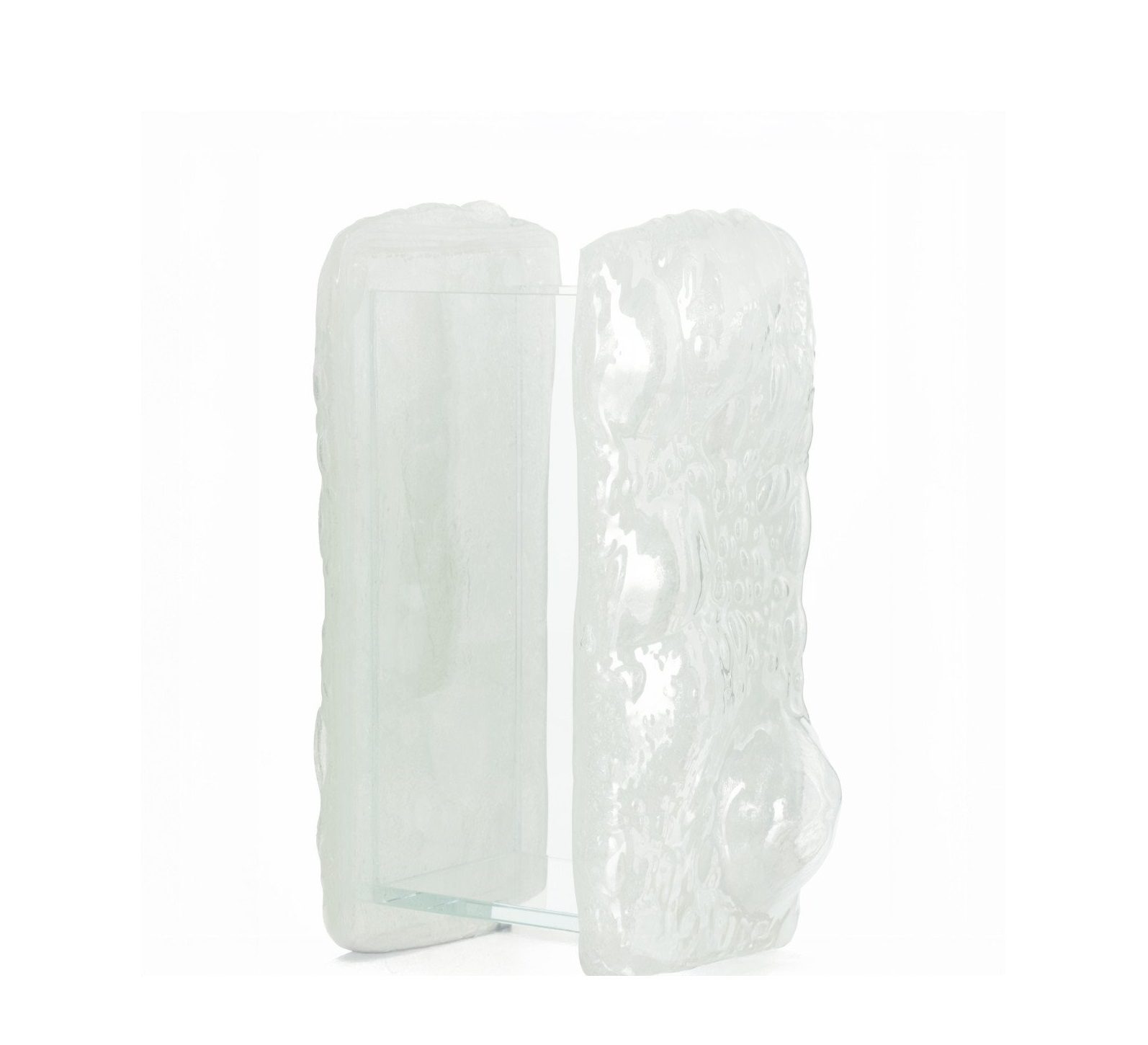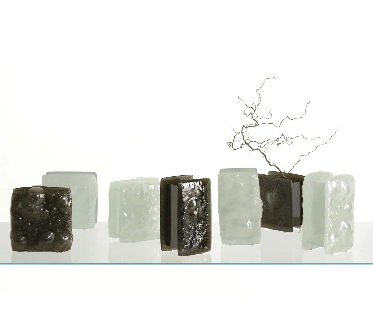 Opalia è una collezione di vasi caratterizzati da due fianchi realizzati fondendo sfridi di cristallo con speciali additivi, così da ottenere delle masse vetrose irregolari, ricche di bolle e dalle superfici ondulate. Questi elementi dalla forte plasticità sono poi incollati a lastre di vetro float, in modo da formare delle vasche con tenuta all’acqua. Disponibili in cristallo extrachiaro o bronzo.