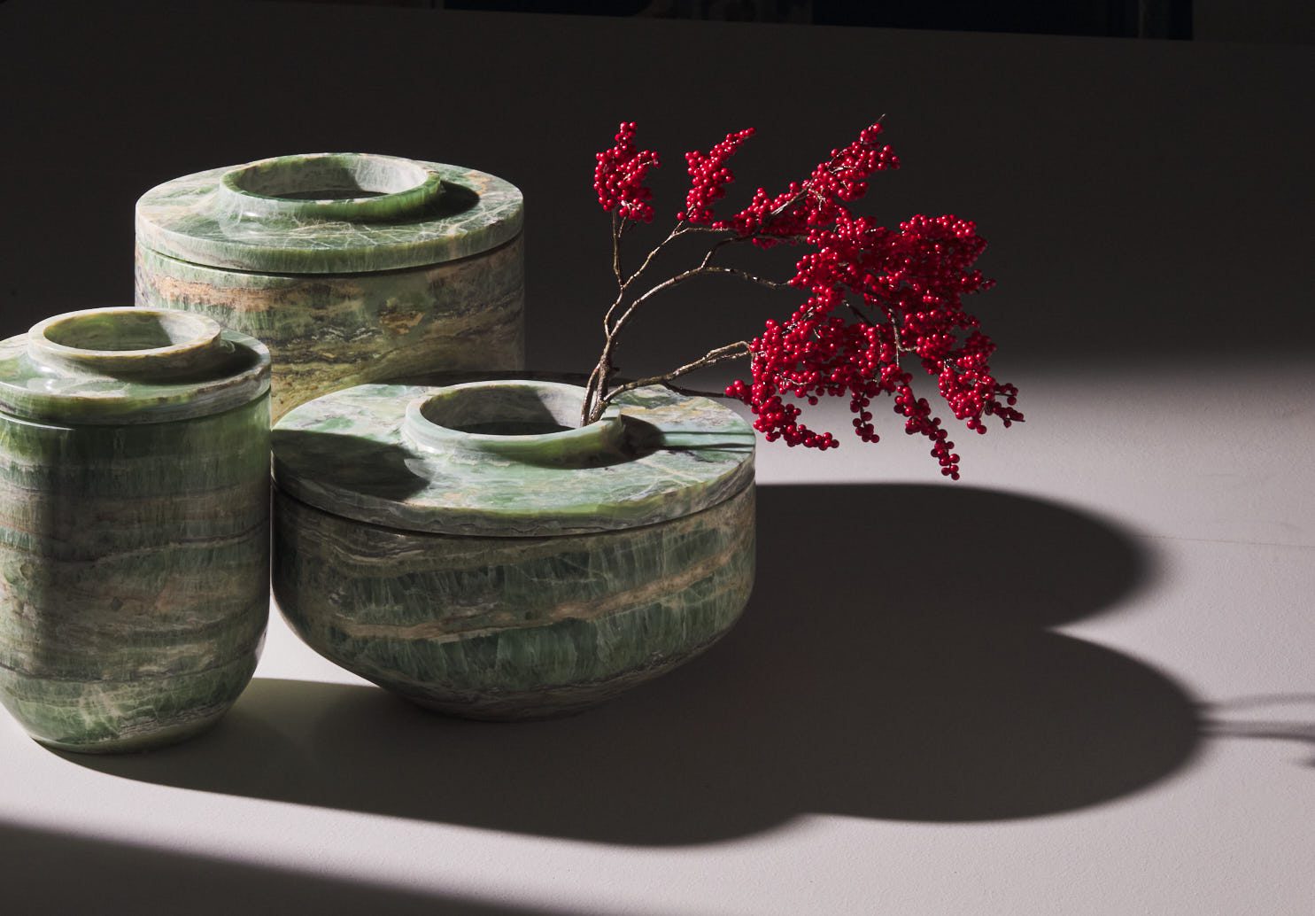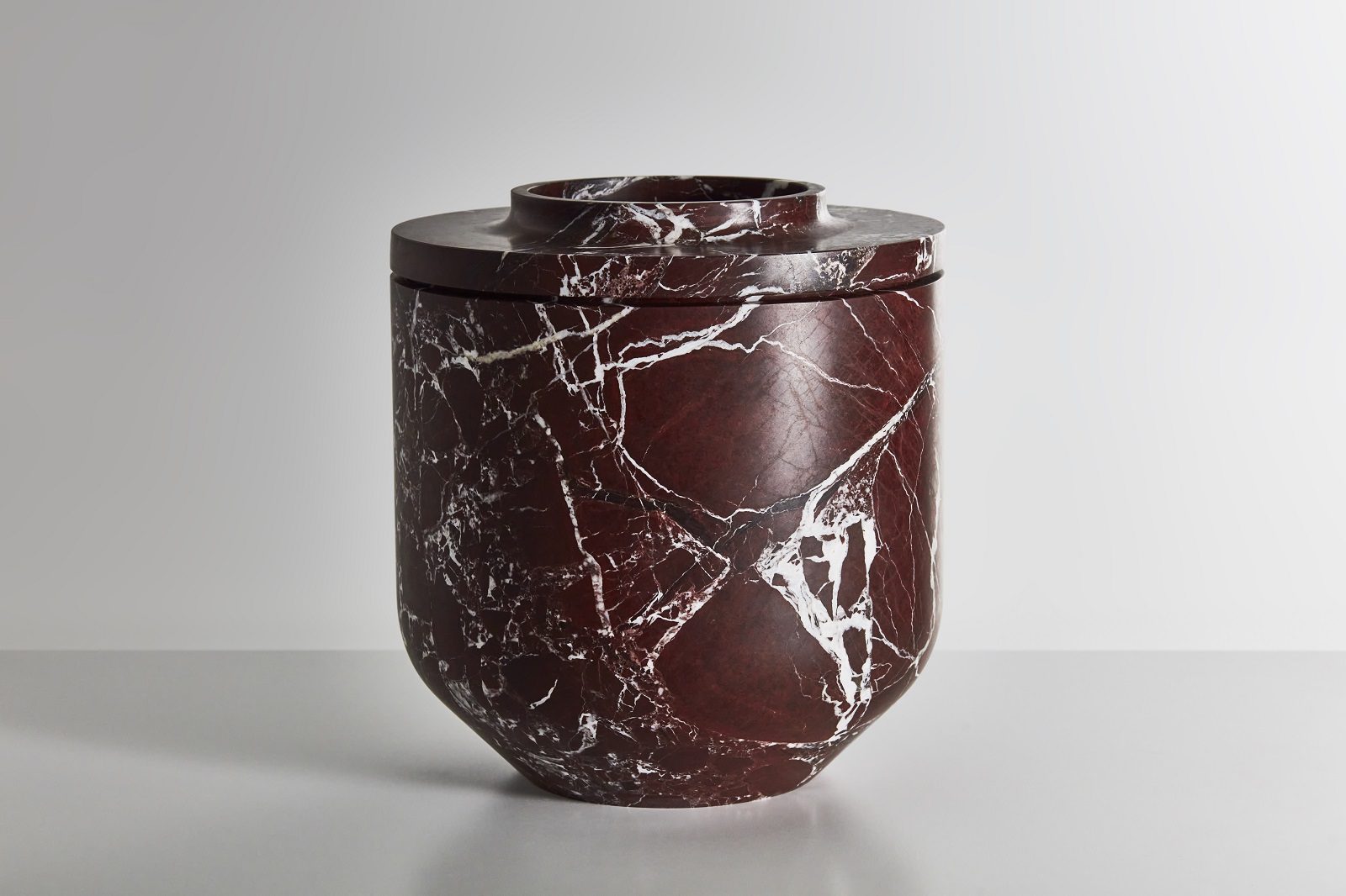 Con Royal, Christophe Pillet firma la prima linea di complementi di arredo in marmo per Kreoo, con tre vasi dalla forma slanciata ed elegante. Le tipologie proposte hanno dimensioni diverse, ma sono analoghe per componenti: il corpo presenta una forma morbida e raggiata in corrispondenza della base e una bordatura arretrata sul profilo superiore che permette l’incastro della copertura, lasciando una sottile fascia di vuoto su tutta la circonferenza.