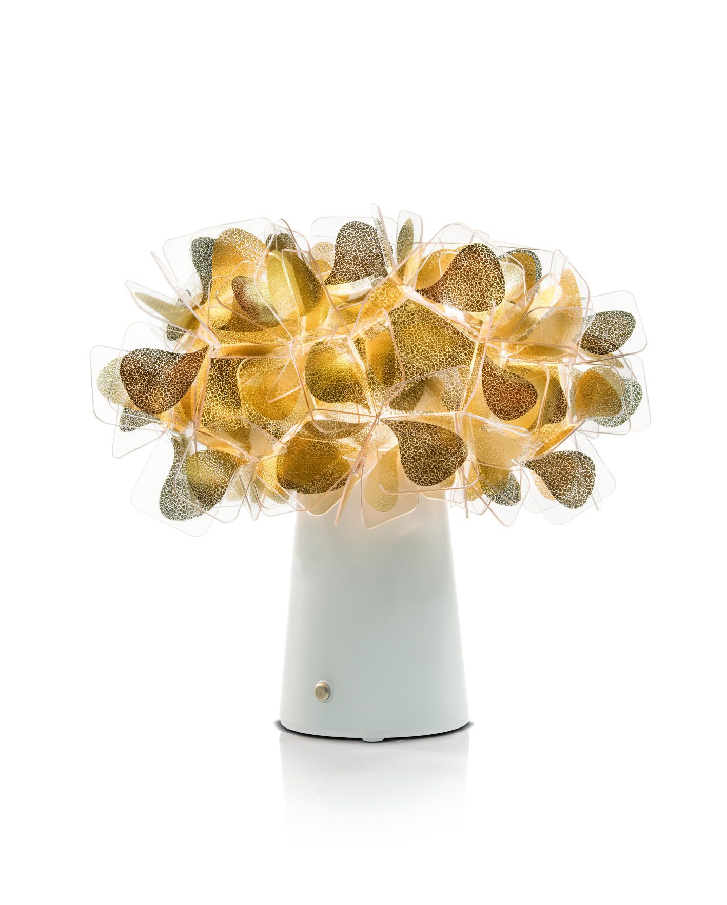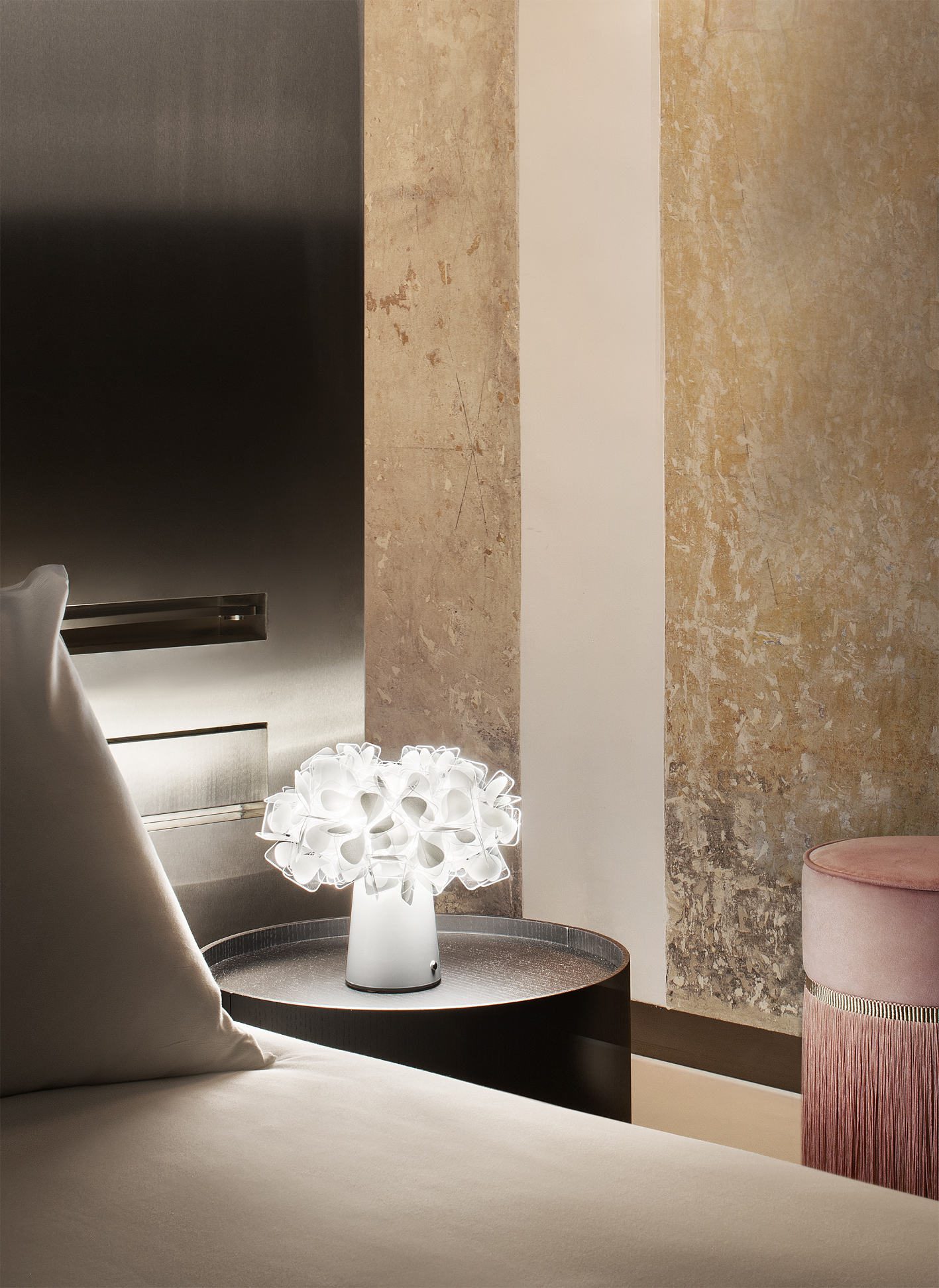 Forme regolari incastrate in un perfetto equilibrio di trasparenze e riflessi compongono il design di Clizia Battery Mama non Mama. La lampada da tavolo riprende le forme della natura: è una nuvola che cattura la luce del sole delle prime ore del giorno e si carica di riflessi cangianti, è la chioma di un albero attraverso la quale la luce filtra e crea giochi con le ombre. La versione Clizia Mama non Mama è stata creata in occasione dei 10 anni della collezione best seller di Slamp.