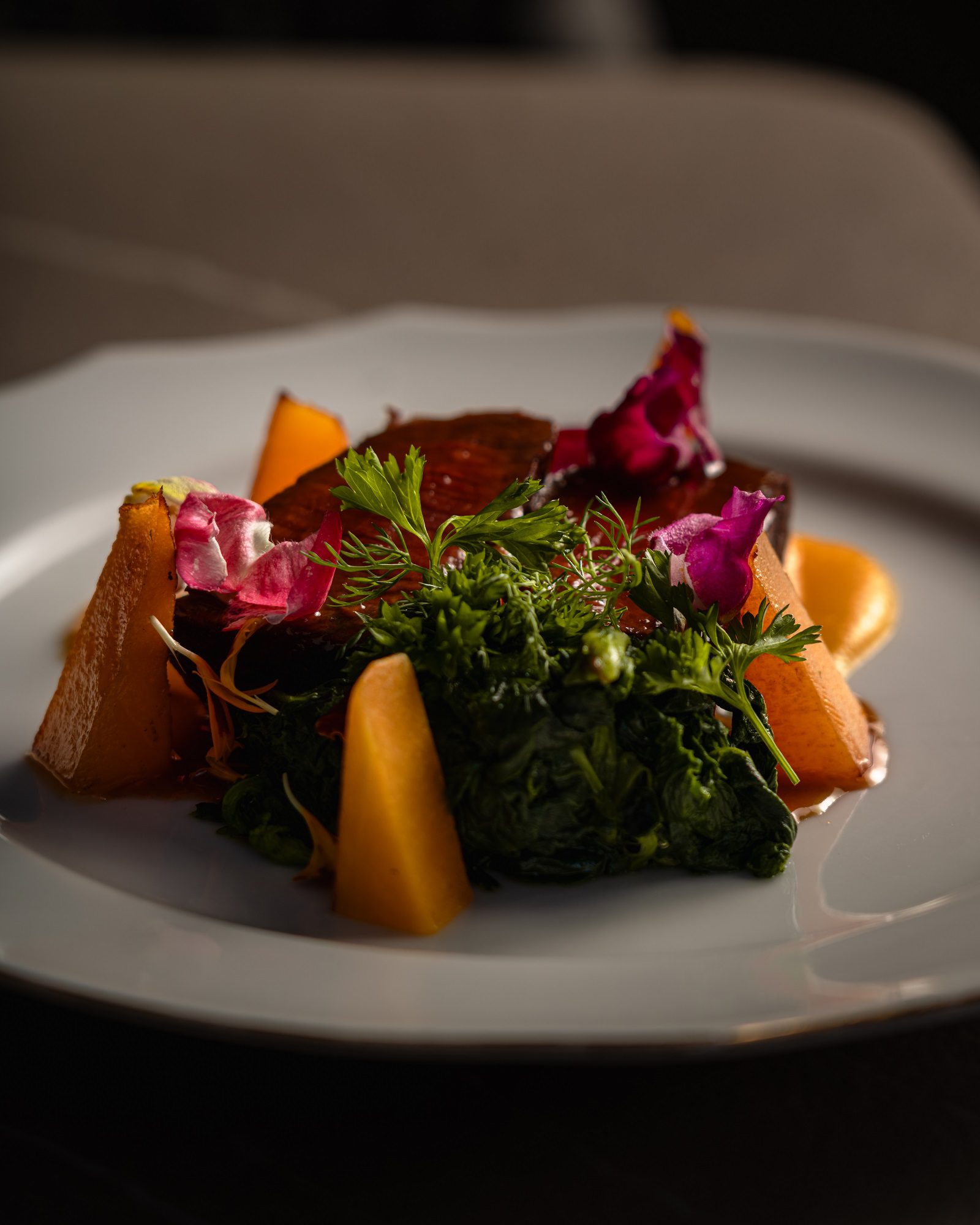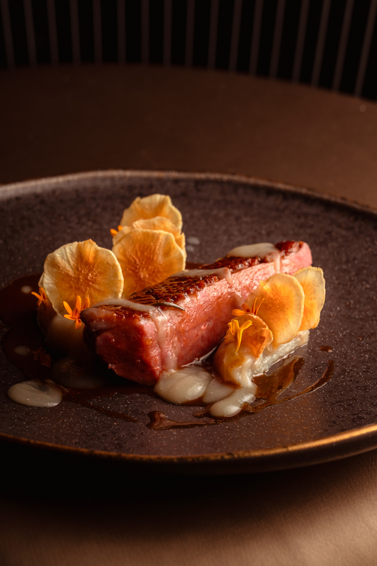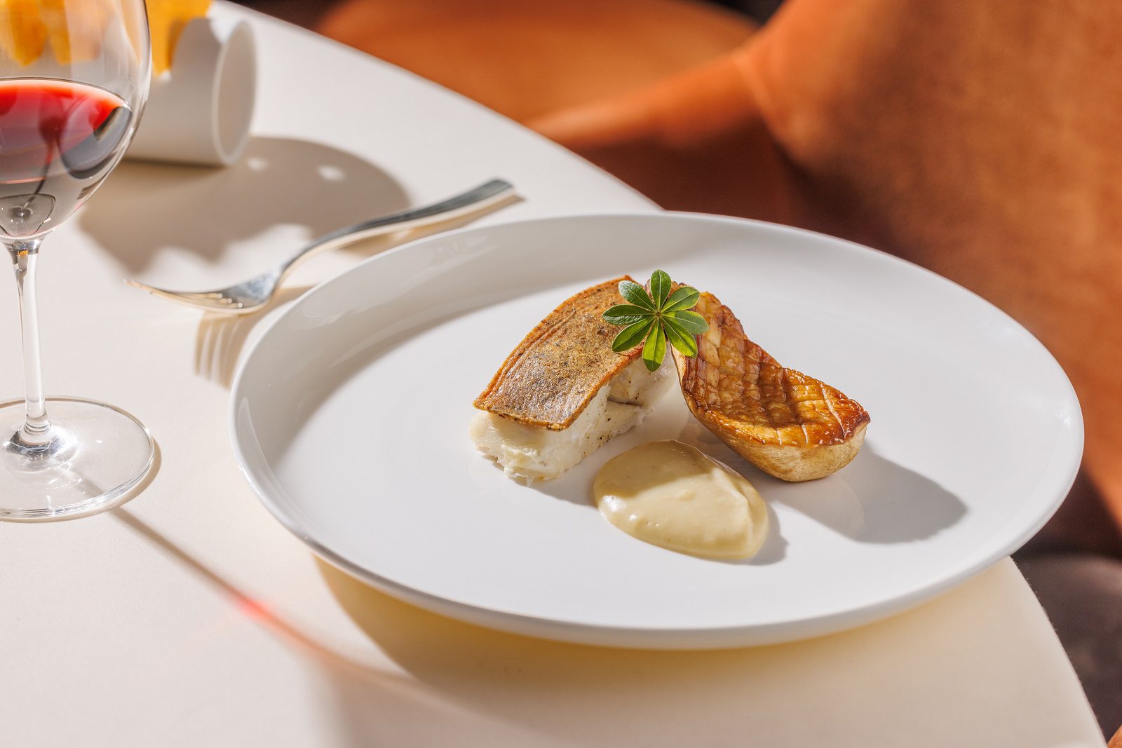 La portata principale è un petto d’anatra servito con una crema di cavolfiore arrosto che ne accompagna la rotondità, mentre il grano saraceno soffiato aggiunge una nota di leggerezza e carattere.