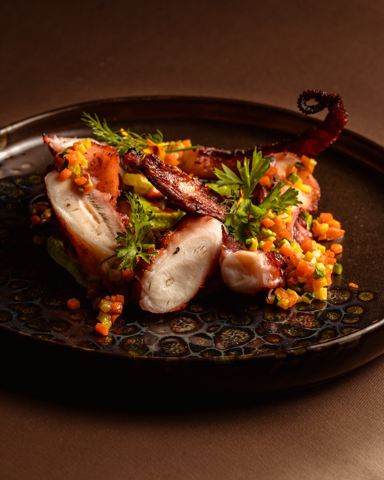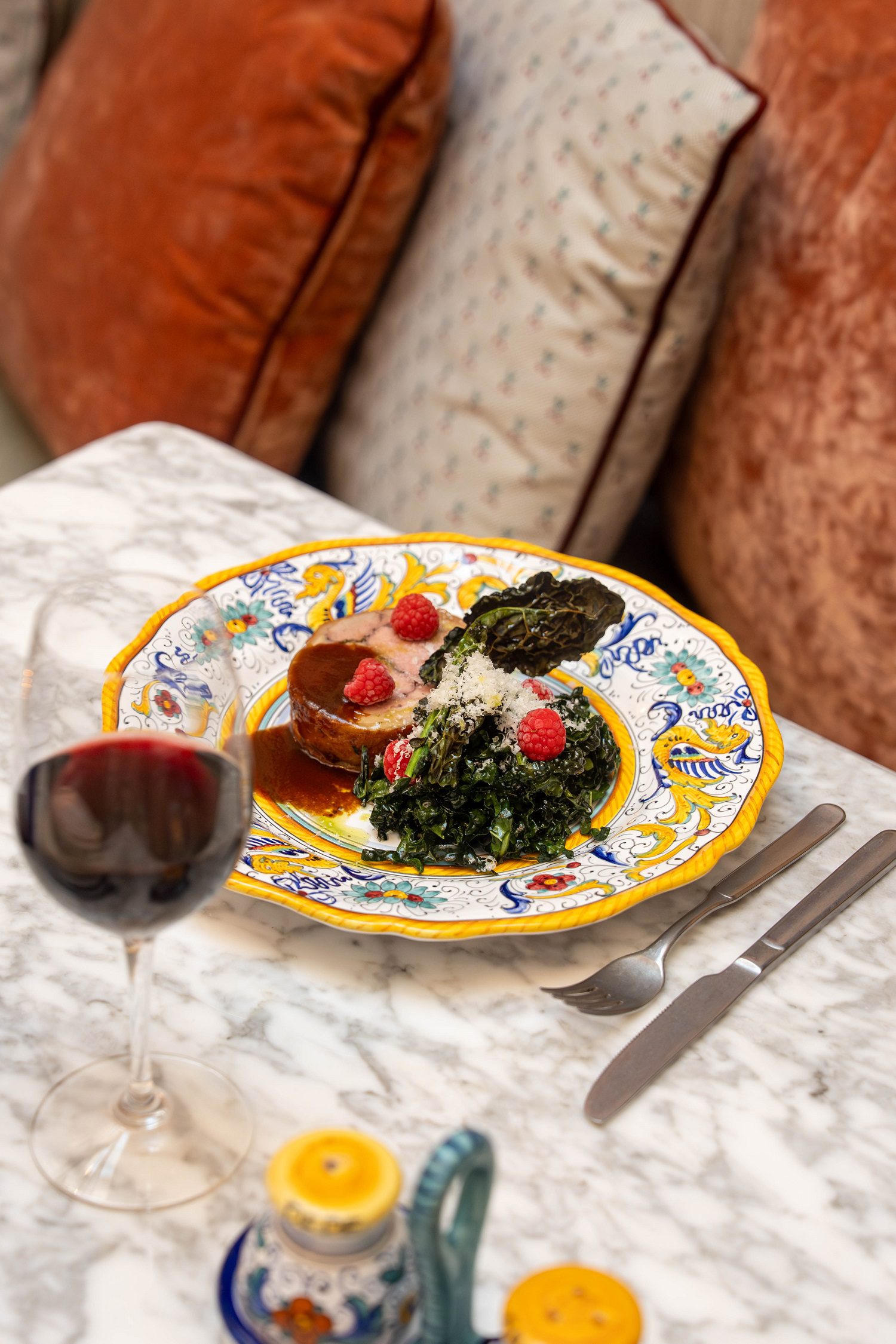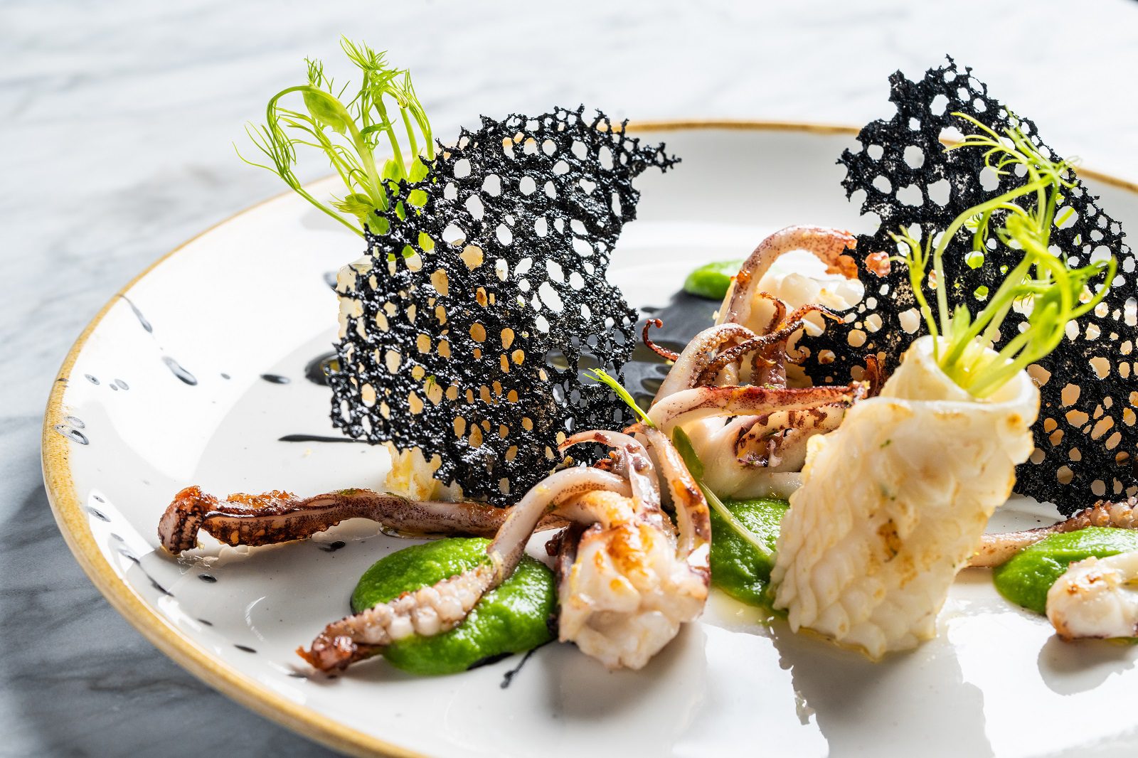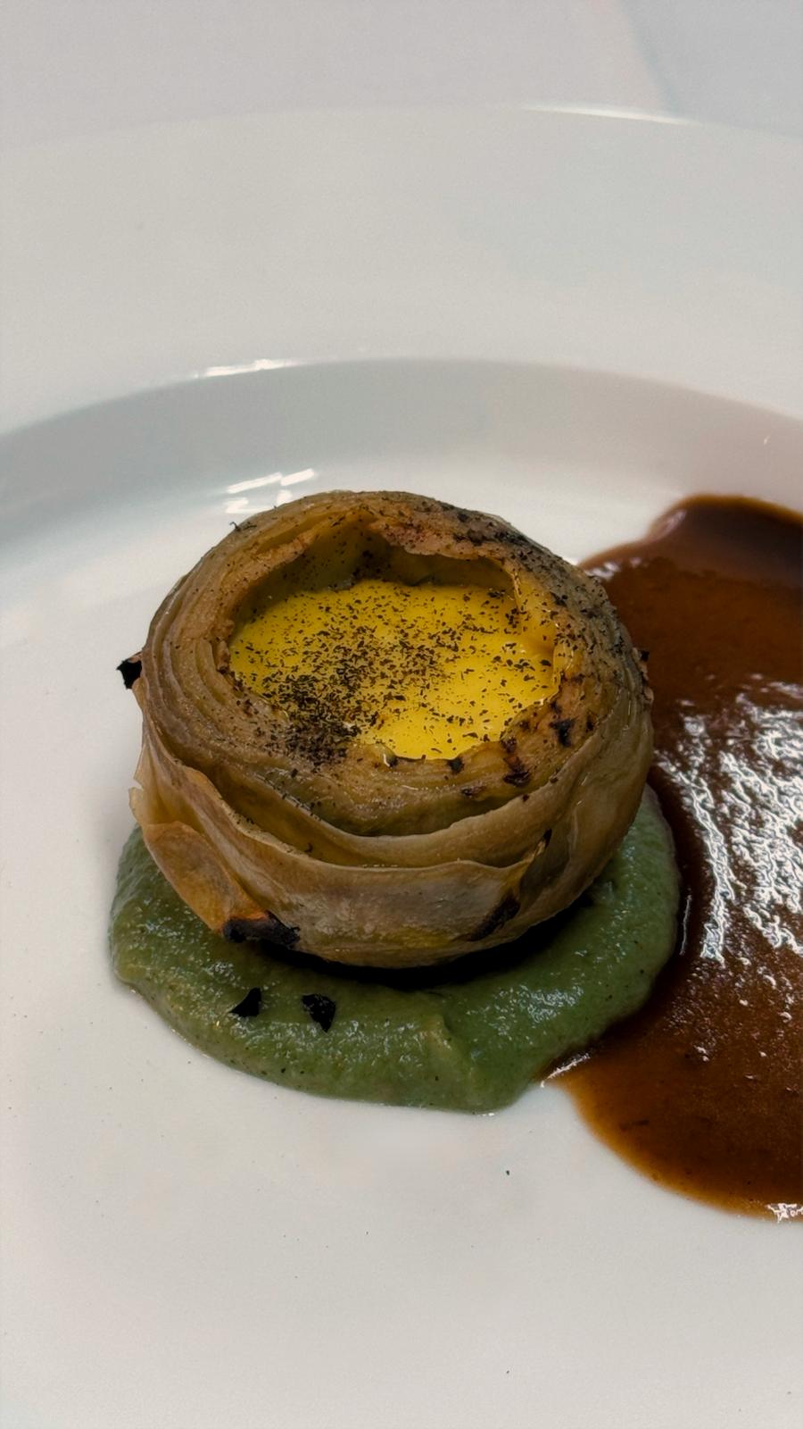 Il viaggio comincia con una sottilissima lamina di seppia, adagiata su patate affumicate e salsa alle acciughe. Prosegue con la sella di coniglio, tenera e profumata, accostata alla nota verde della cima di rapa e alla croccantezza dorata della granella di pistacchio.