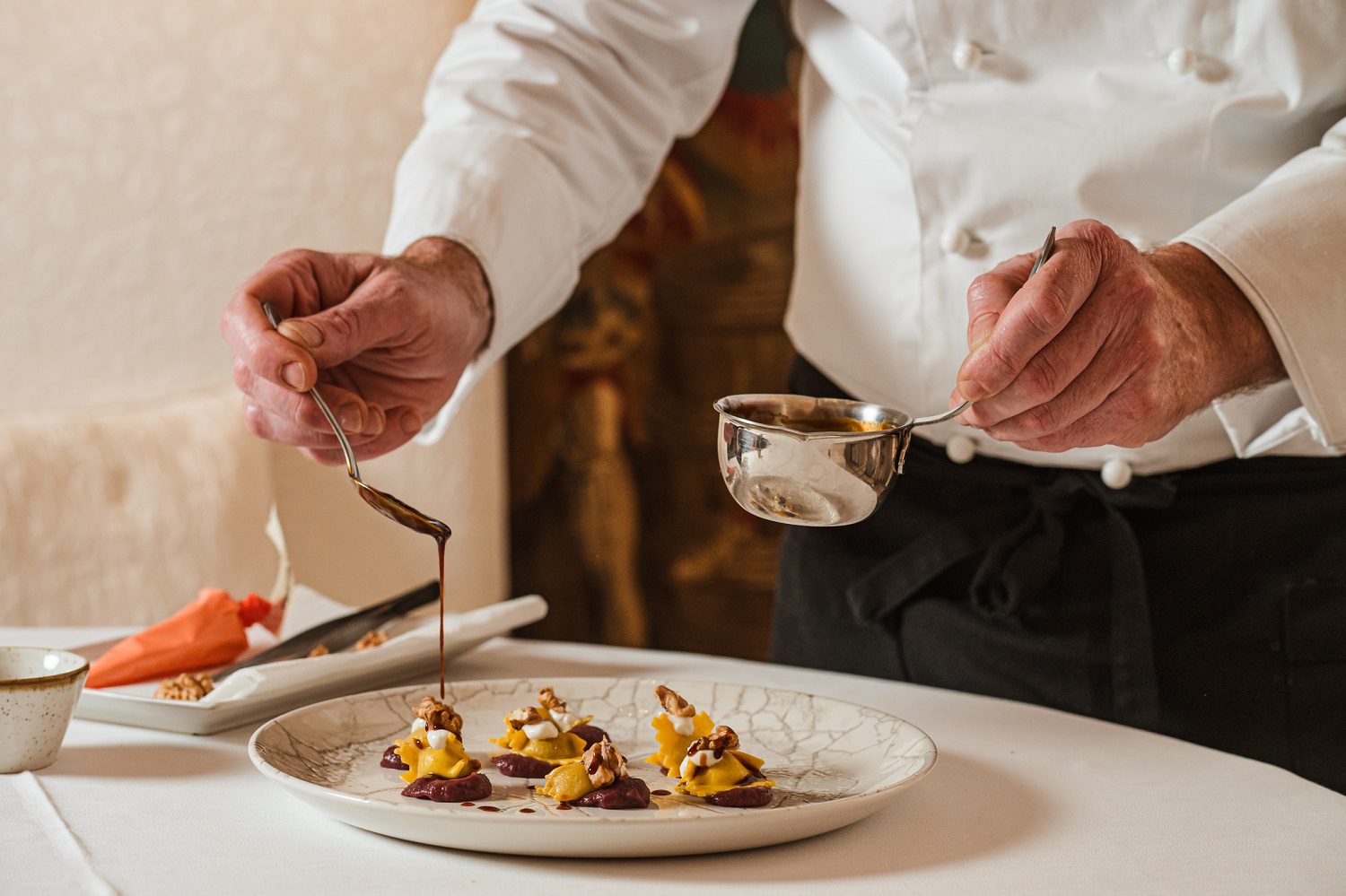 Il Ristorante Sottovoce, al piano alto dell’edificio con terrazza panoramica sui tetti medievali, firma due menu esclusivi ideati dall’Executive Chef Fabio Aceti.