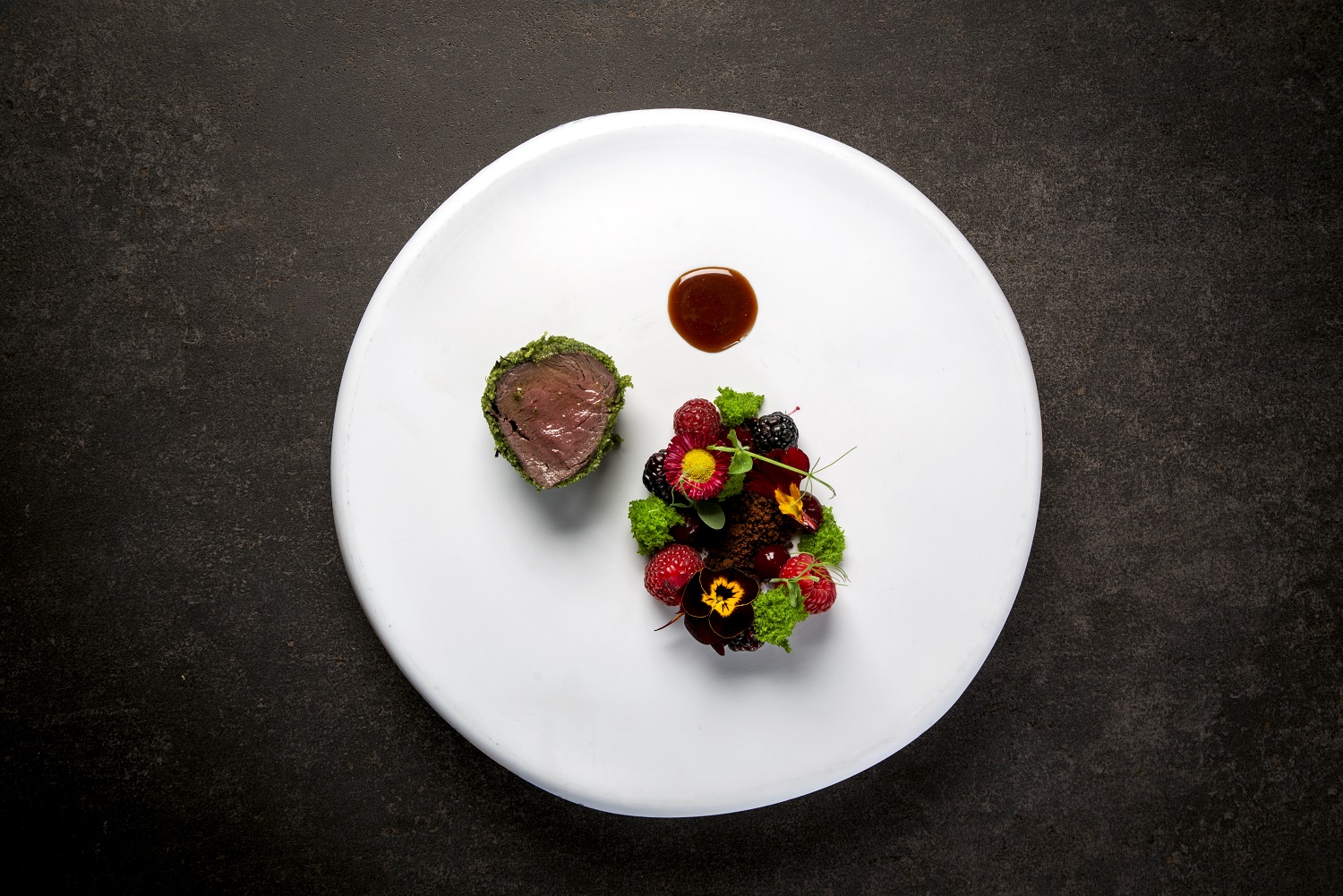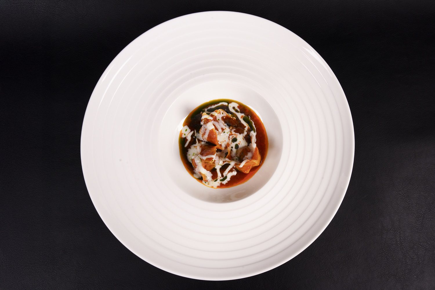 I primi piatti celebrano la terra e i suoi aromi profondi: un riso Carnaroli avvolto da uno zabaglione ai funghi, impreziosito dalle foglie di fico, dall’intensità del porcino e dal tocco dell’aglio nero; e i ravioli di cervo, immersi in un brodo di aringa affumicata e aneto che ne esalta la rusticità elegante.