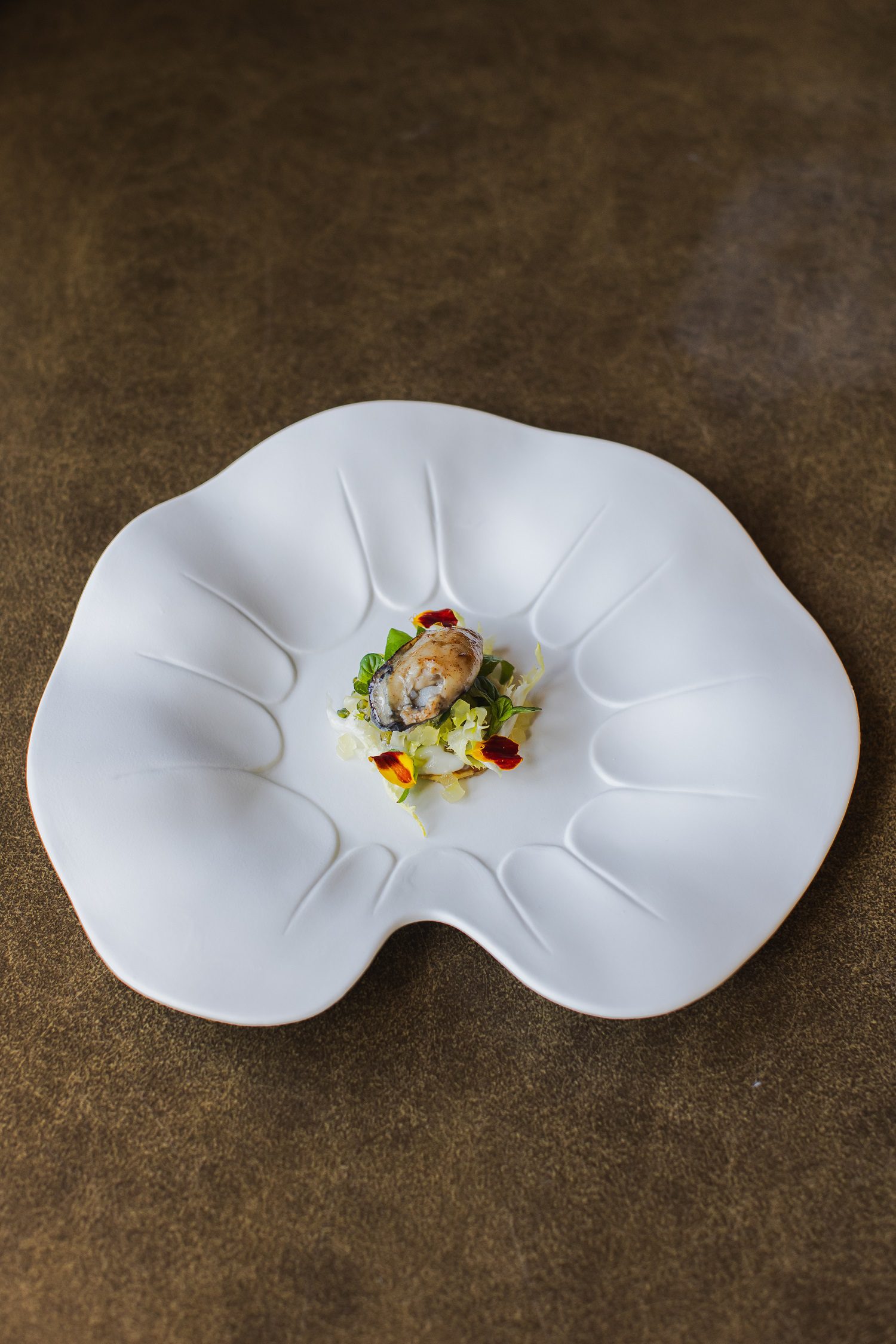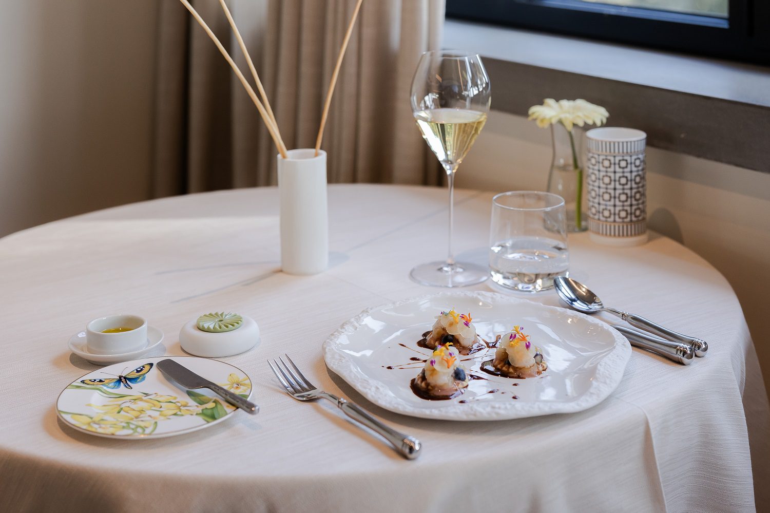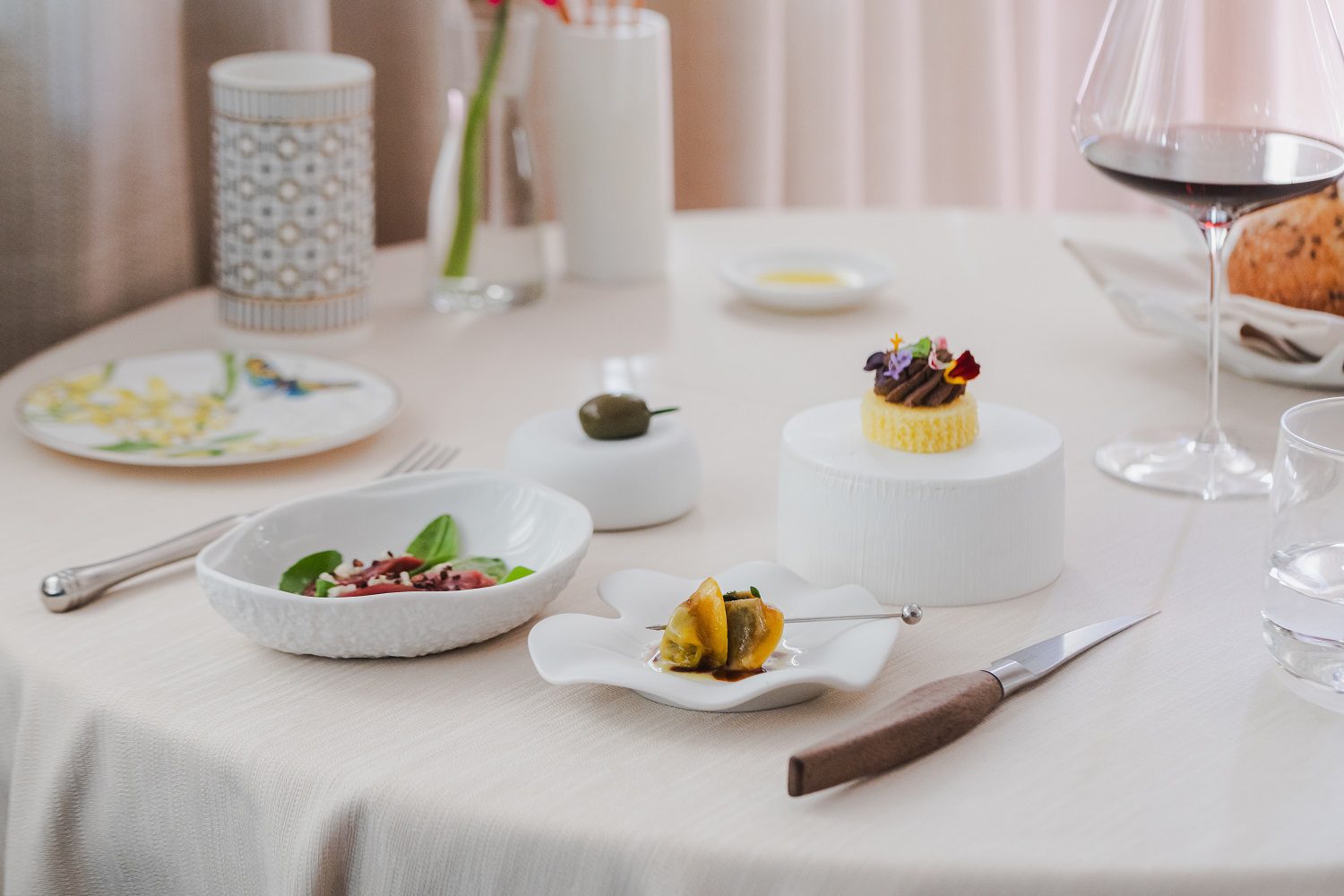 Il pranzo si apre con una selezione di amuse bouche accompagnati da un elegante flûte di Champagne Louis Roederer ‘Théophile’ Brut, preludio a un viaggio culinario che unisce territorio, tecnica e creatività.