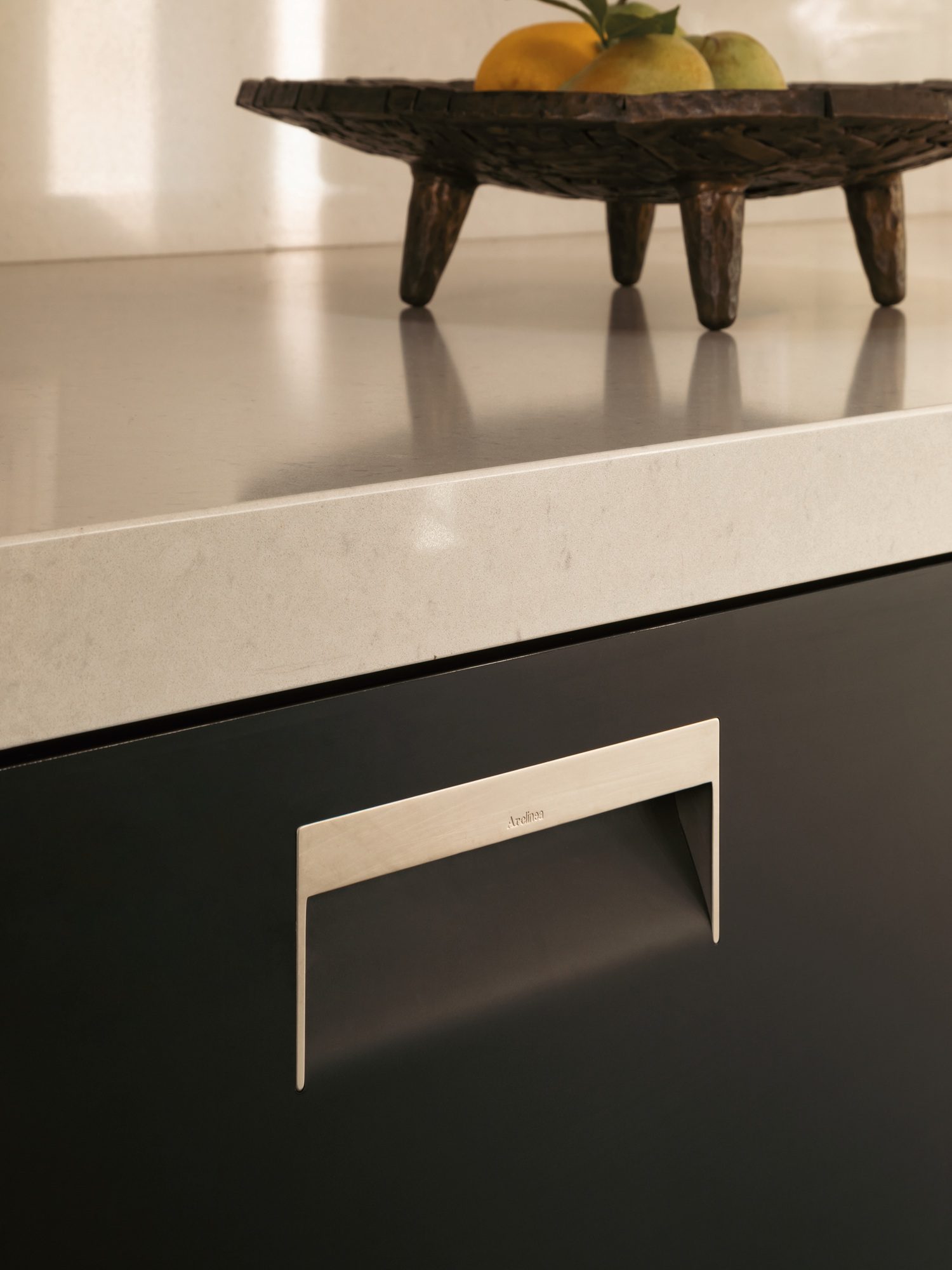 La disposizione segue un layout a doppio flusso che traduce nel domestico l’efficienza distributiva delle cucine professionali. A sinistra, un mobile freestanding in Fenix crea un volume morbido che garantisce contenimento senza ostruire la connessione visiva con la scala. Al centro di questa coreografia spaziale, il tavolo da pranzo con piano in vetro acidato agisce come cerniera trasparente: il punto di incontro tra preparazione e consumo, sottolineando un’architettura che, pur nella sua precisione tecnica, rimane devota alla dimensione conviviale della vita.