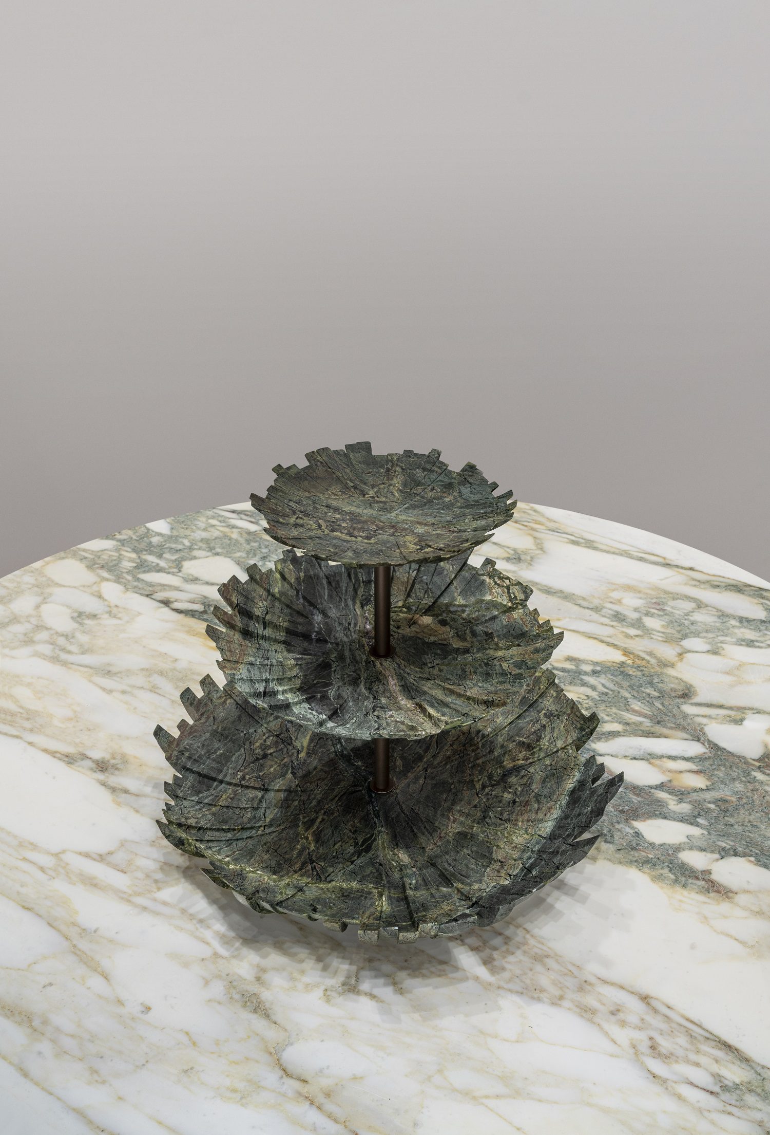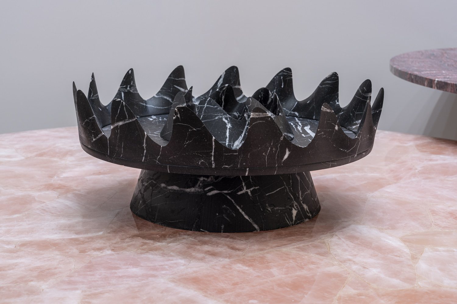 Gli otto centritavola che compongono la collezione si distinguono per la varietà dei marmi policromi – tra cui la Sodalite, il Confusion Red, il Calacatta Antico e l’Emerald Quarzite – per le forme scolpite e per gli ornamenti raffinati che ne esaltano la sensualità tattile.