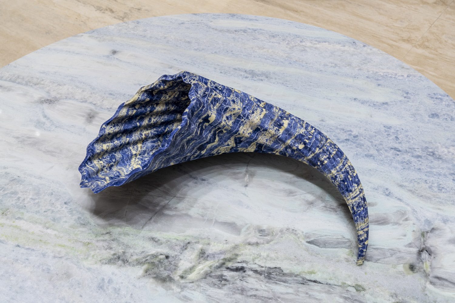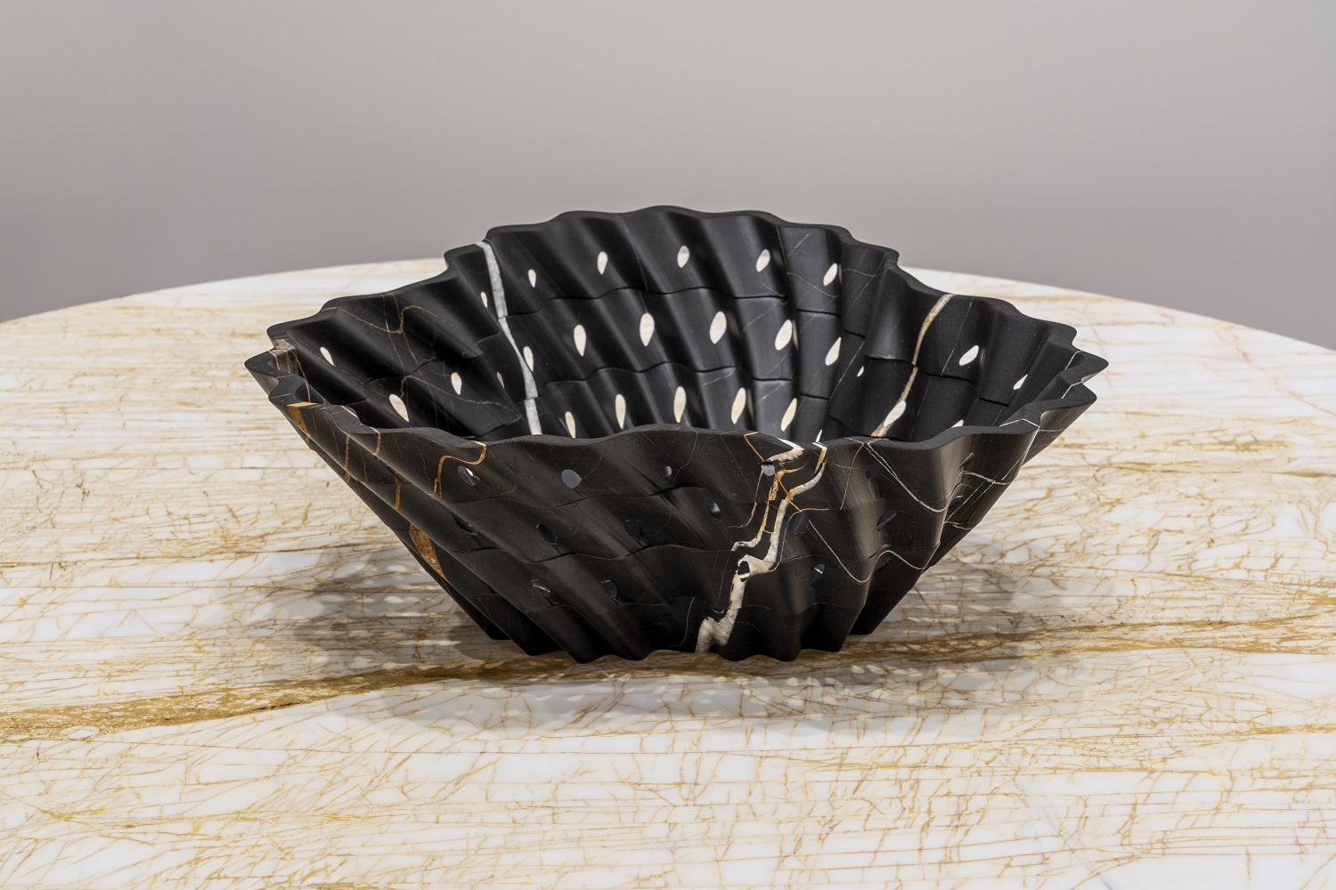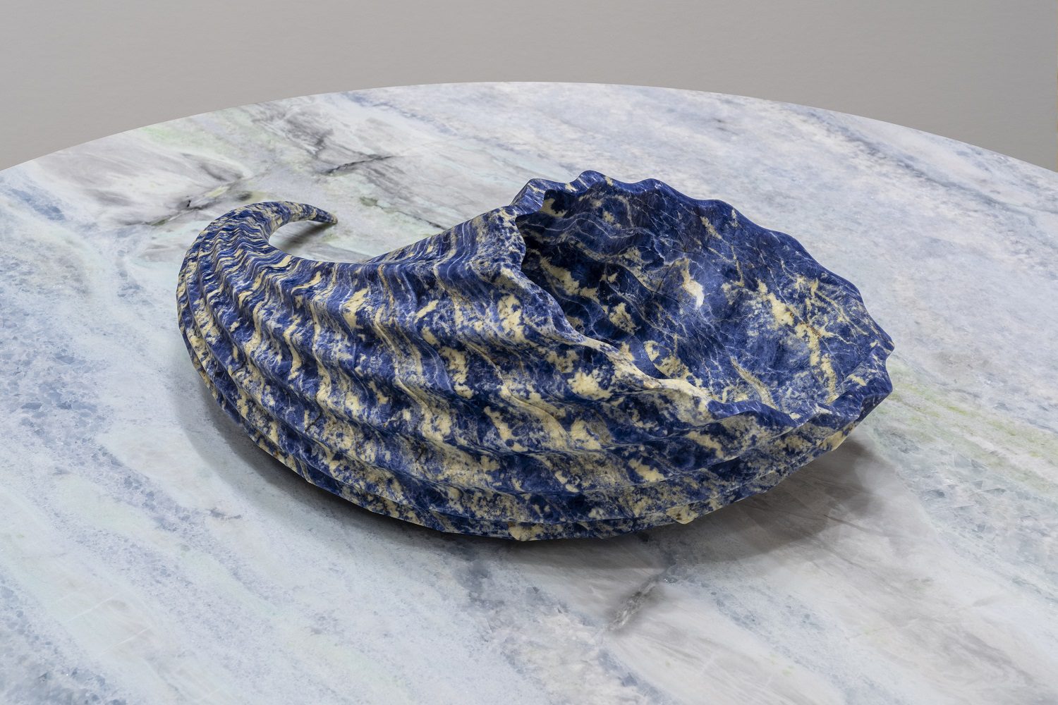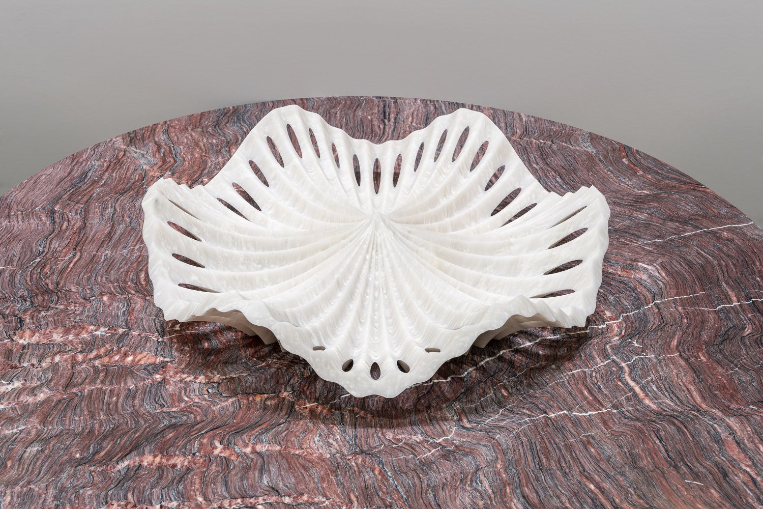 “È la materia litica stessa, fortemente caratterizzata dalla sua massa profonda, a indurre il mio pensiero progettuale allo scavo, un atto necessario e liberatorio – spiega Raffaello Galiotto. – Strumenti evoluti e governati numericamente mi hanno permesso di portare alla luce forme inedite, capaci di contenere e insieme di attrarre lo sguardo verso il punto mediano del tavolo”.