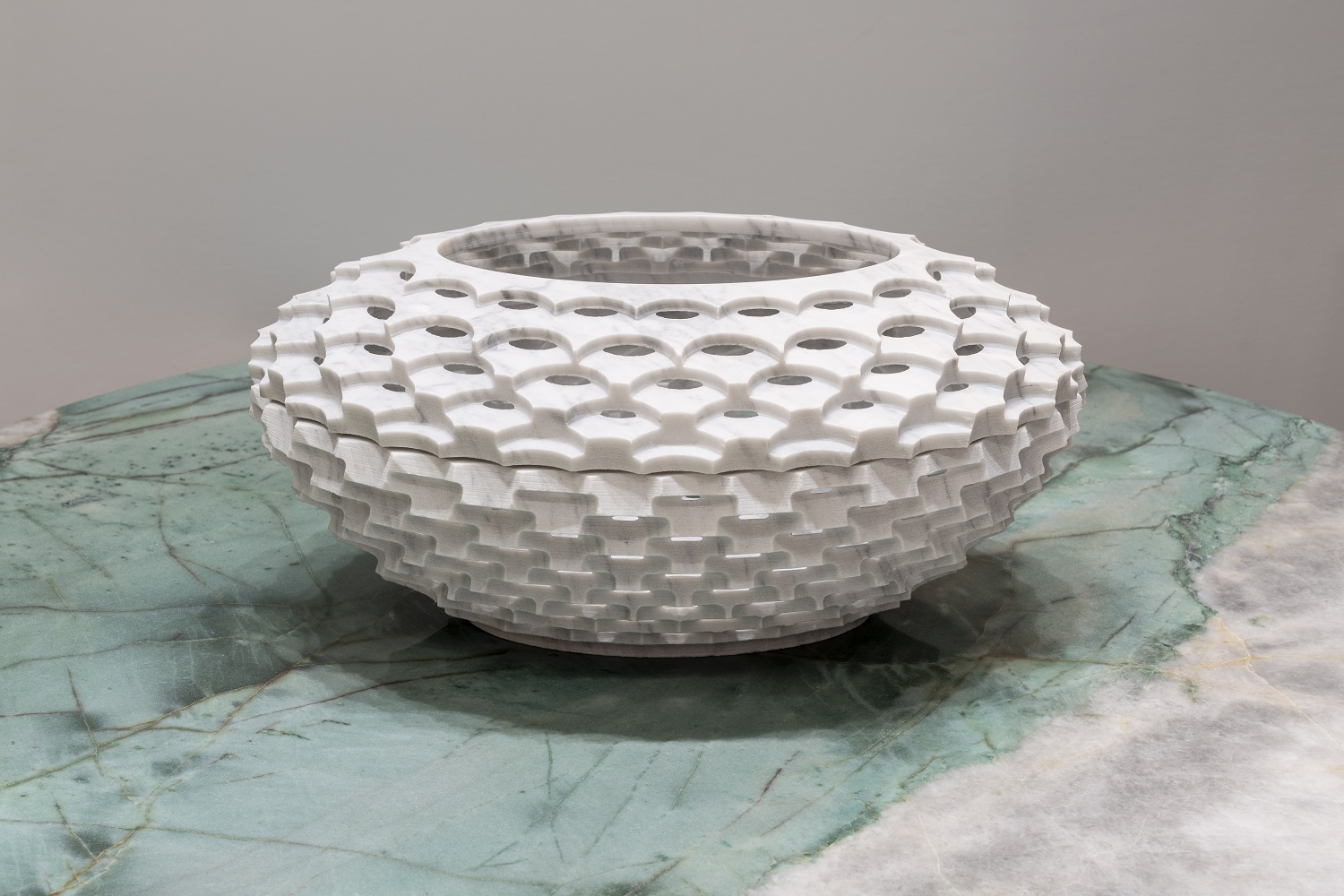 Un lento processo di disvelamento, ottenuto attraverso la progressiva asportazione del massello o il taglio della lastra di marmo, realizzato con utensili di alta precisione spinti al limite della tecnologia. Seguendo un disegno predefinito, la lavorazione dà forma a oggetti capaci di accogliere frutta o altri elementi, ma anche di attrarre lo sguardo e condurlo verso il centro del piano del tavolo, espressione del nostro innato senso dell’ordine.