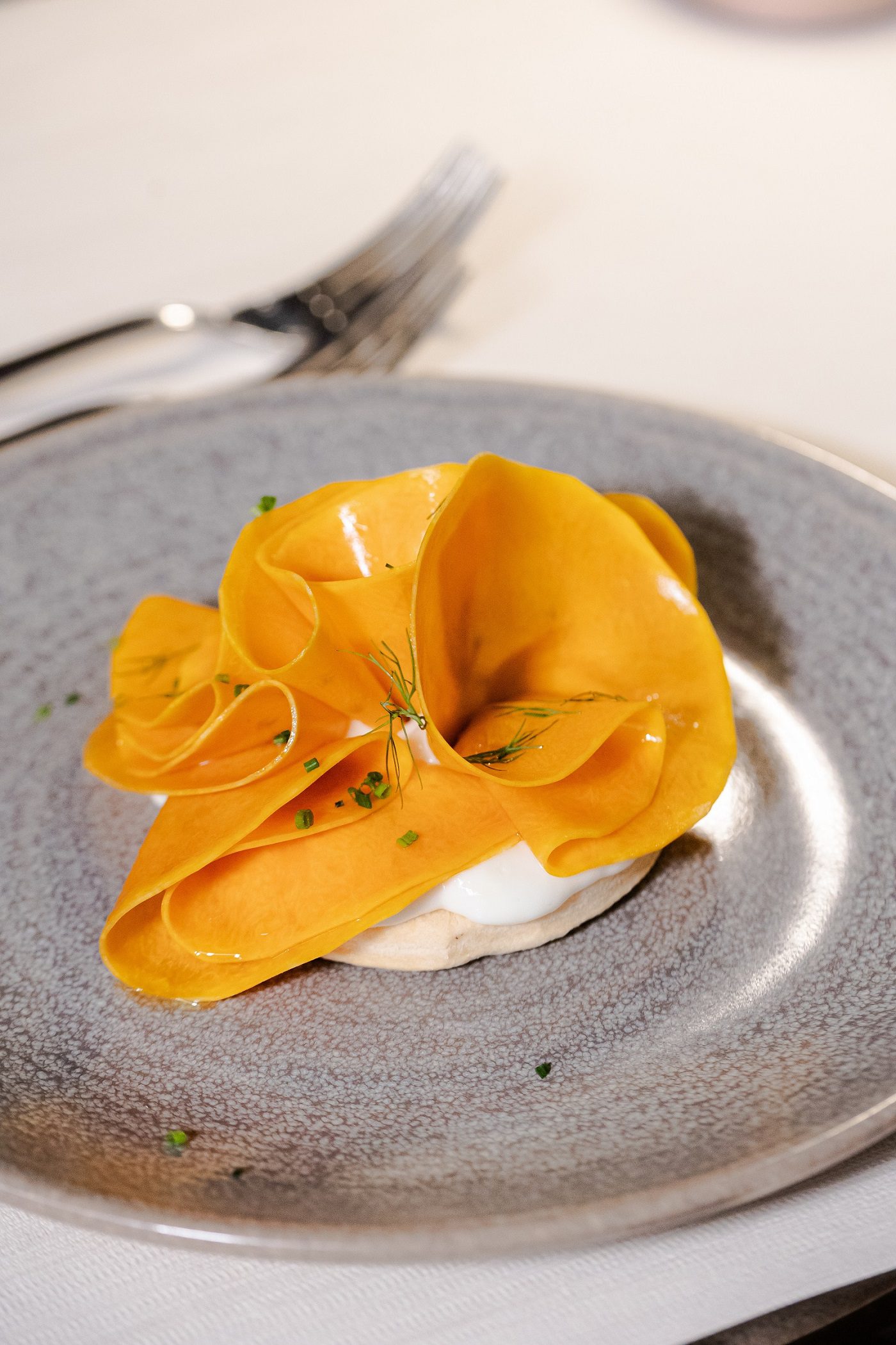 Una brisée dorata e friabile, fragrante al morso e dal profumo di burro appena sfornato, accoglie un vellutato stracchino montato con panna, soffice come una nuvola e impreziosito dai sentori freschi e aromatici di erba cipollina e timo. Sopra, come un velo autunnale, si adagiano sottili petali di zucca violina marinata in una delicata emulsione di olio extravergine d’oliva, soia, miso e aceto, che sprigiona un irresistibile equilibrio tra dolcezza vellutata e note sapide e umami.