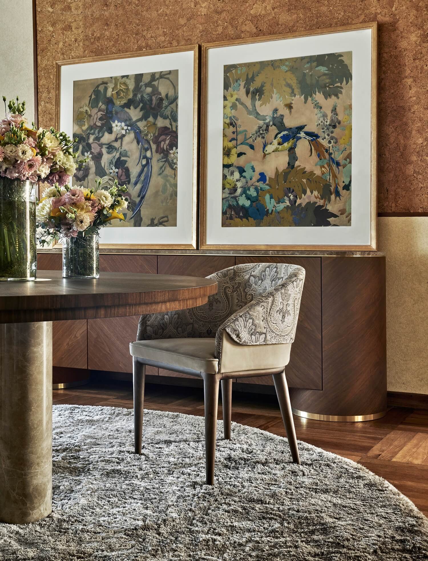 Splendida in abbinamento, la sedia Picabia unisce sapientemente elementi classici a creatività e sperimentazione. La base in legno, naturale e senza tempo, omaggia la tradizione, mentre i tessuti espressivi della collezione conferiscono al pezzo intensità e significato, in perfetto stile Etro Home Interiors.