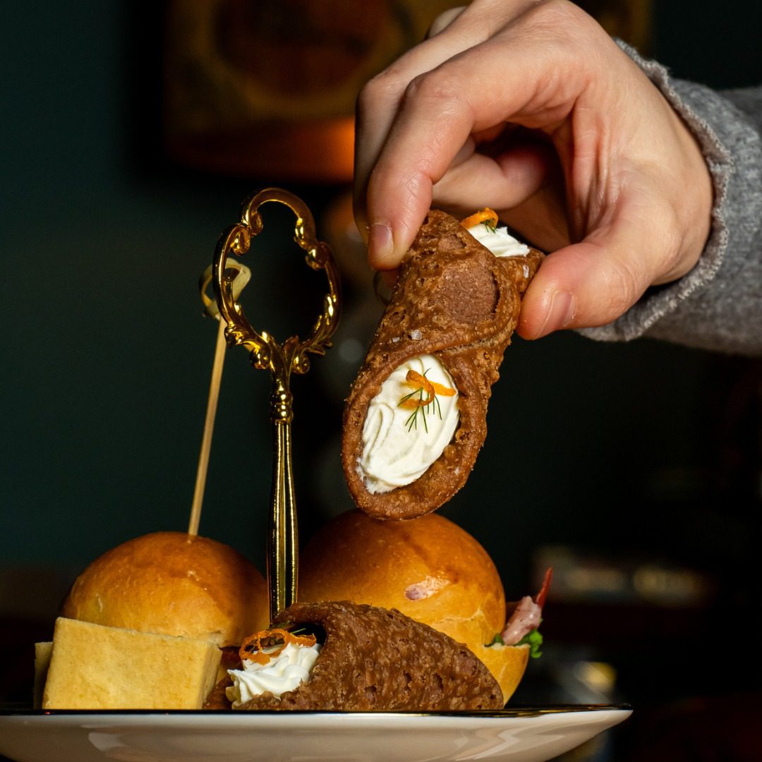 Tra le proposte più apprezzate, l’Afternoon Tea si trasforma in un appuntamento speciale. La selezione dolce e salata è costruita con delicatezza sartoriale: torcetti al burro, lingue di gatto, biscotti al cioccolato e un sorprendente biscotto al cacao salato accompagnano una coppia di piccole crostate all’arancia, la torta del giorno e un maritozzo in versione gastronomica con stracciatella, salmone e peperone crusco. Il percorso prosegue con un assaggio di formaggi di Pienza e il morbido pão de queijo di ispirazione sudamericana servito con culatta. Un rituale elegante e goloso, perfetto come momento di festa pomeridiano o come idea regalo a partire da 35 euro a persona.