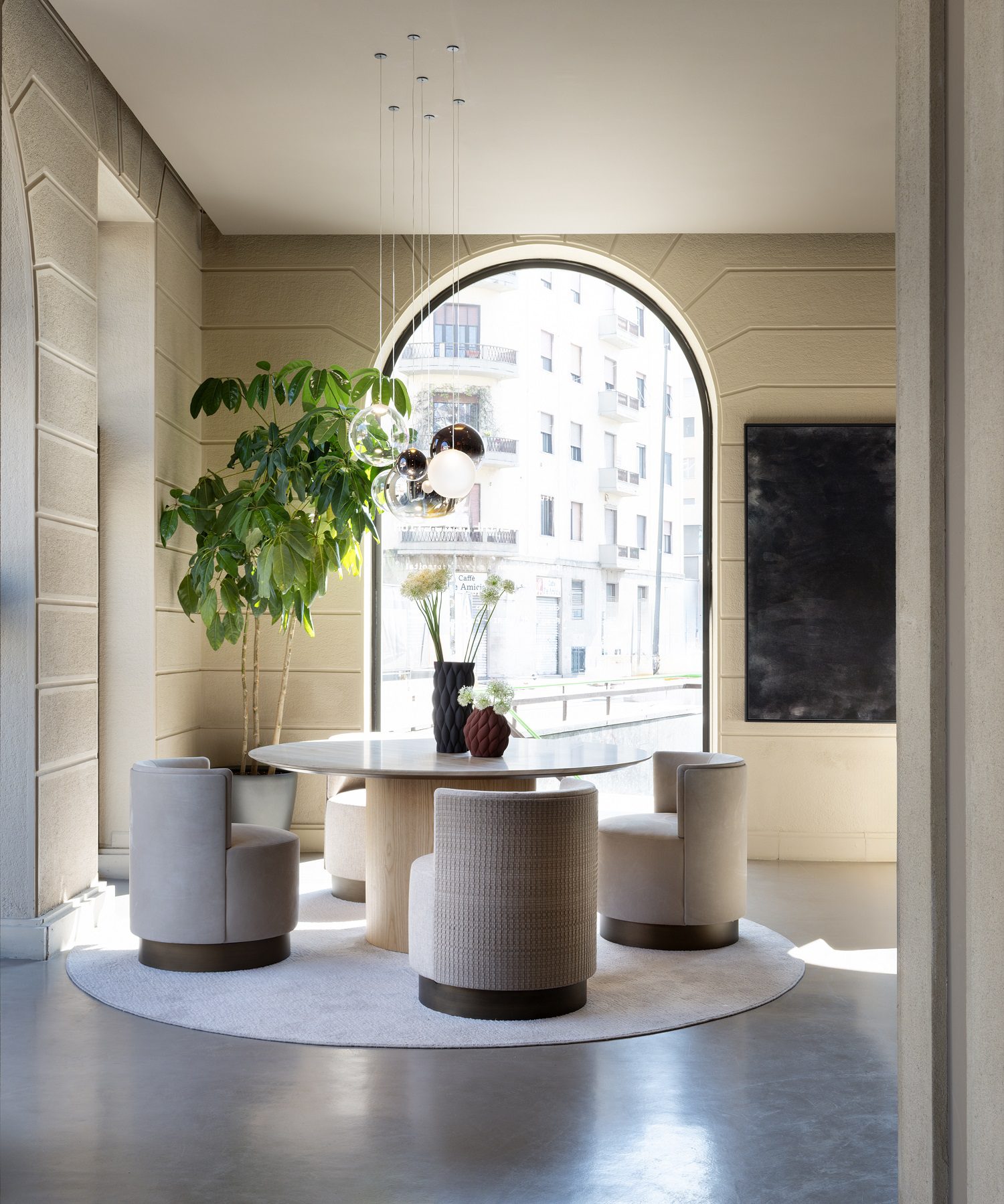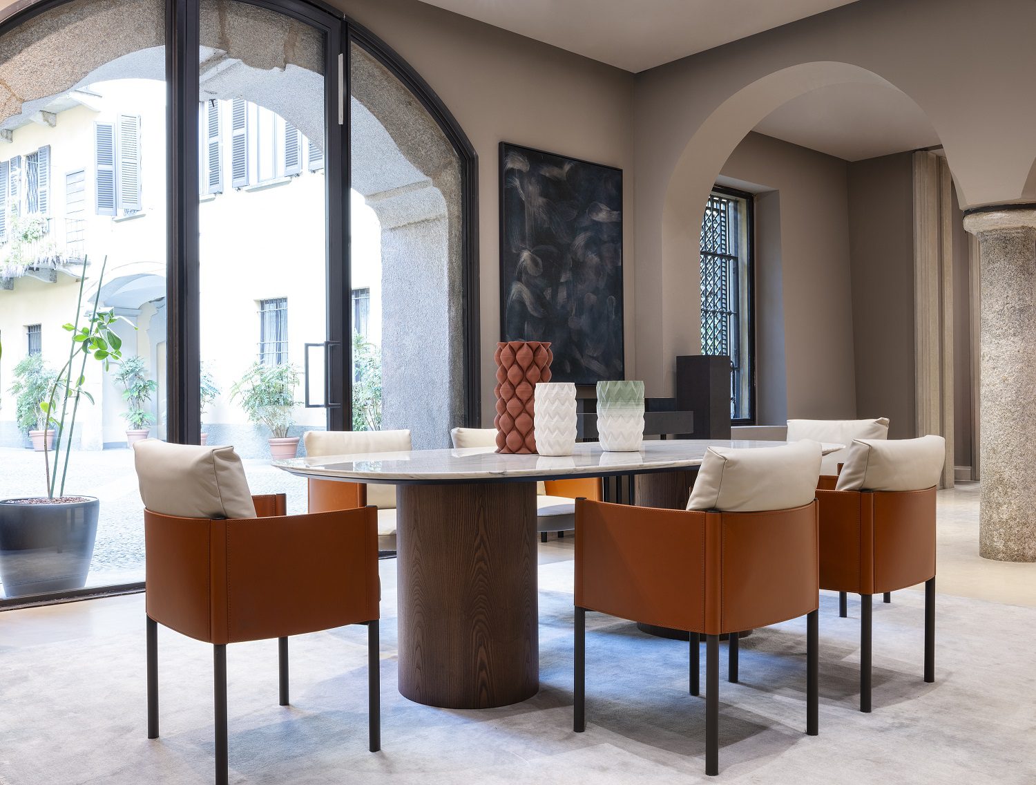 La forza garbata del suo design si traduce in sottili piani circolari che si contrappongono a solide e imponenti basi cilindriche.