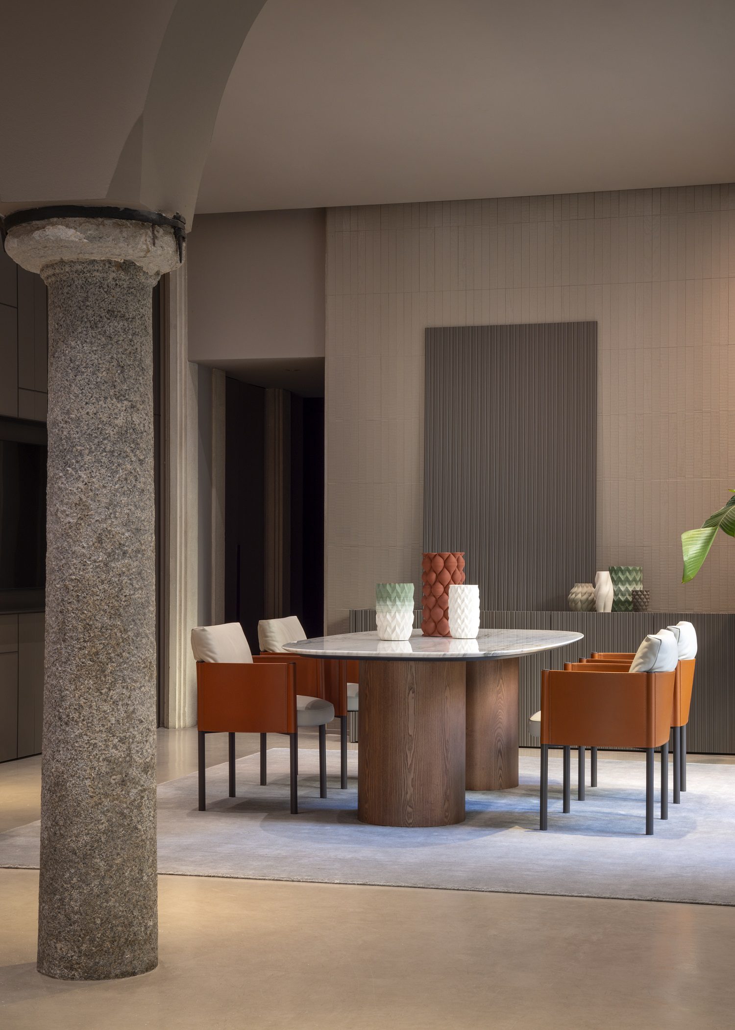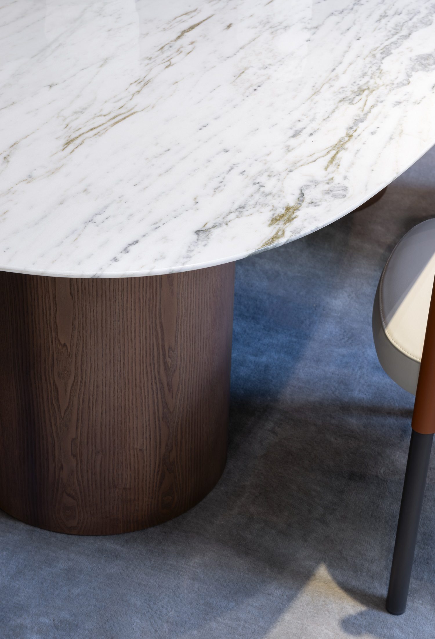 I tavoli da pranzo, armonici nelle forme generose, sono caratterizzati dalla simmetria compositiva tra top e base. Disponibili con piano ovale e tondo, ciascuno in due dimensioni, rappresentano un invito alla convivialità. Il tavolo tondo si compone di un’imponente base cilindrica centrale su cui poggia il piano, da 160 e 180 cm, mentre il piano ovale, da 240 e da 280 cm, è sostenuto da una doppia base cilindrica.