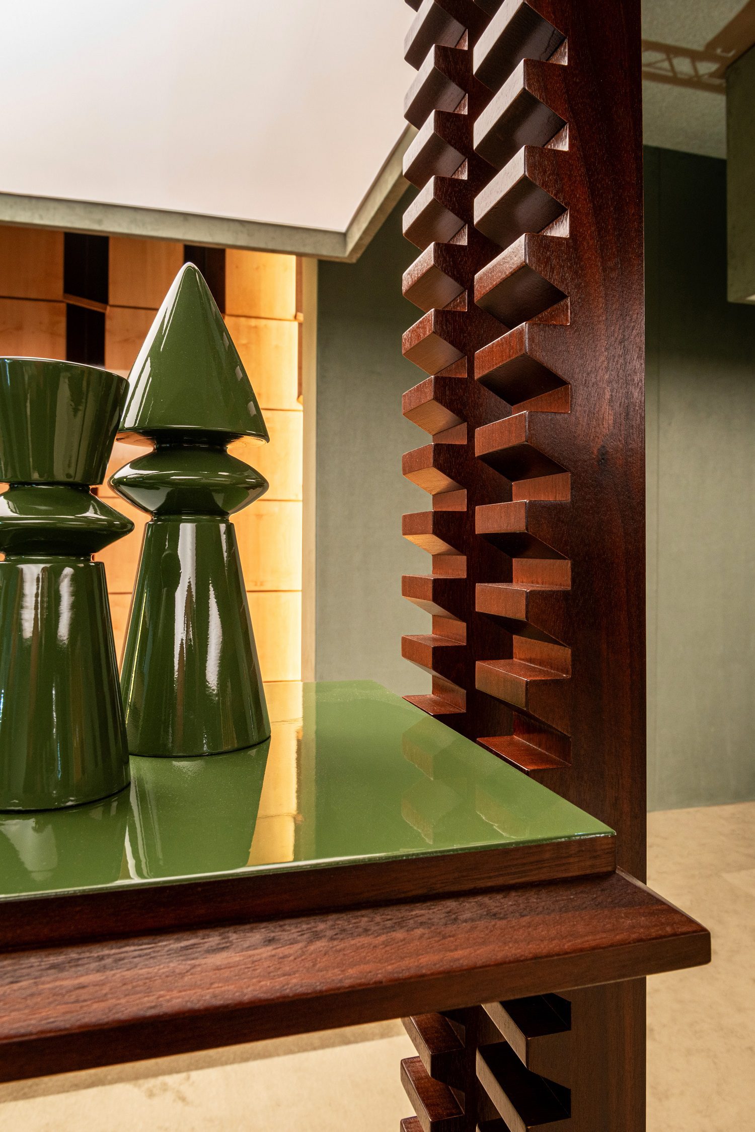 Sebbene la cremagliera rappresenti un elemento tipicamente “industriale”, nel progetto assume un’eco Brancusiana, creando un suggestivo connubio fra tecnica costruttiva e ispirazione culturale e artistica. I ripiani, con bordi sagomati sempre in legno massello di noce tinto scuro e i top laccati lucidi, possono essere facilmente smontati e riposizionati, offrendo un’estrema flessibilità compositiva. Le finiture raffinate e il design funzionale donano al sistema un carattere contemporaneo e altamente personalizzabile, capace di adattarsi alle esigenze più diverse.