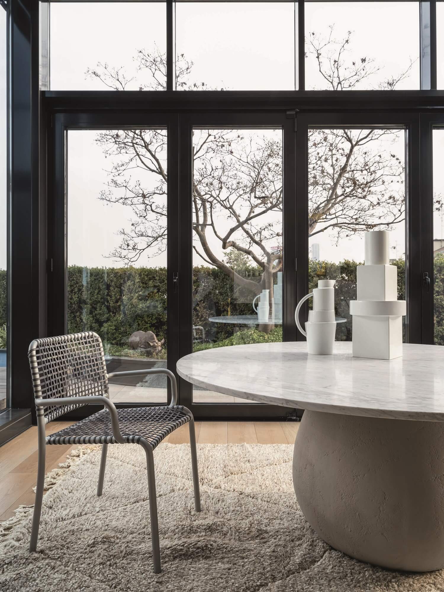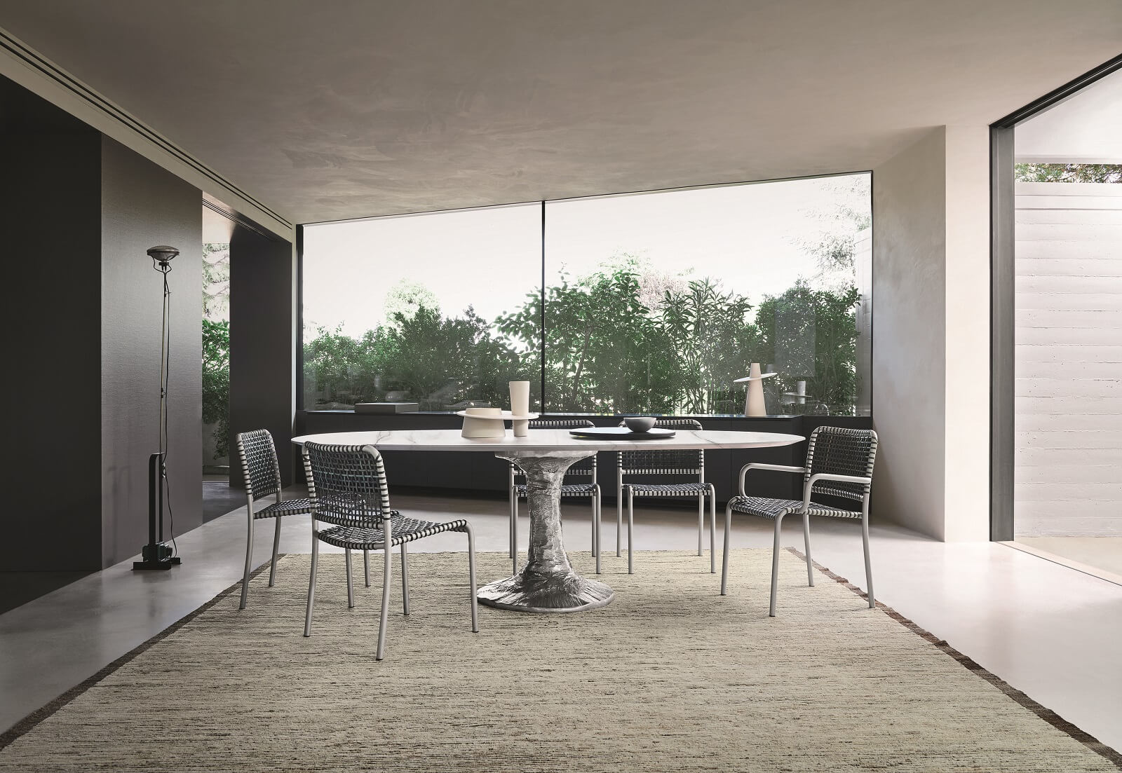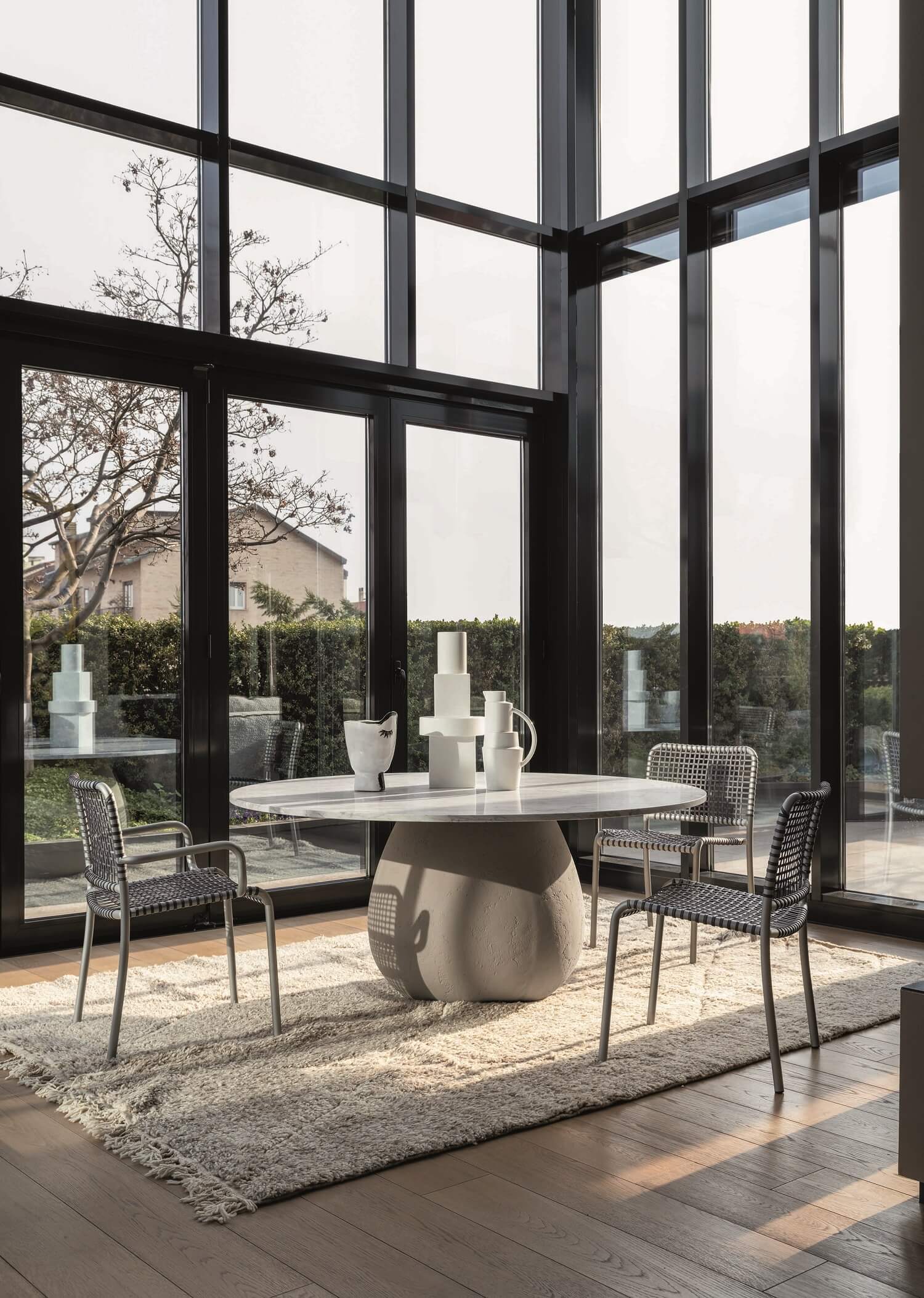 Dalla collezione Moon, firmata da Paola Navone, nasce una famiglia di tavoli che fonde materiali apparentemente distanti in un unico gesto armonico. La base, una grande anfora in ceramica blu dalla texture irregolare ottenuta con una speciale finitura manuale, sostiene un piano rotondo in fusione di alluminio. Nel contrasto tra la densità materica della ceramica e la lucentezza metallica dell’alluminio, il tavolo Moon trova la sua identità poetica: un incontro di volumi e colori che rinnova il dialogo tra artigianalità e materiali ricercati.