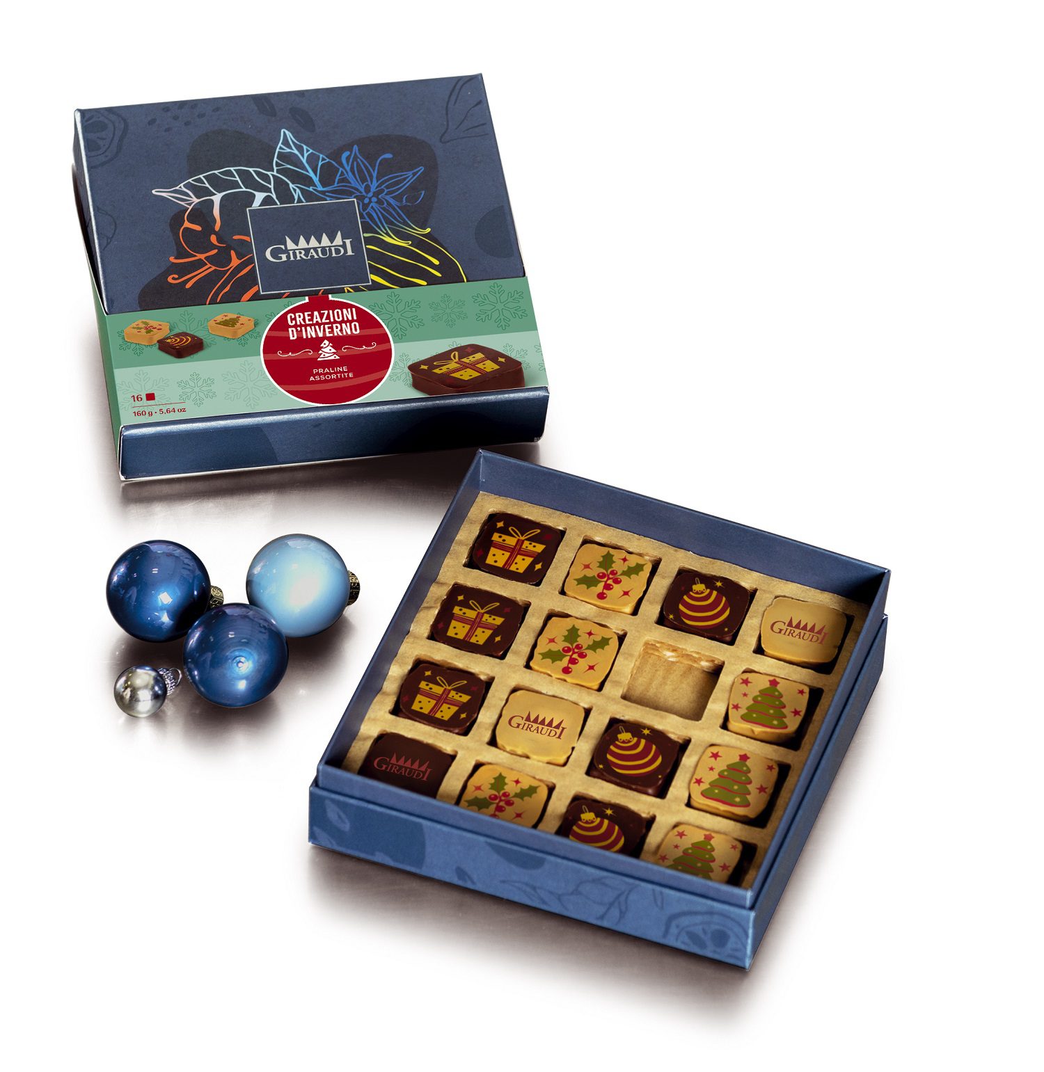 Le Creazioni d’Inverno, quattro praline ispirate ad altrettante ricette tipiche della tradizione italiana (Panforte, Castagnaccio, Torrone e Fichi secchi ripieni alle noci), presentano delle nuove decorazioni serigrafate a tema natalizio.