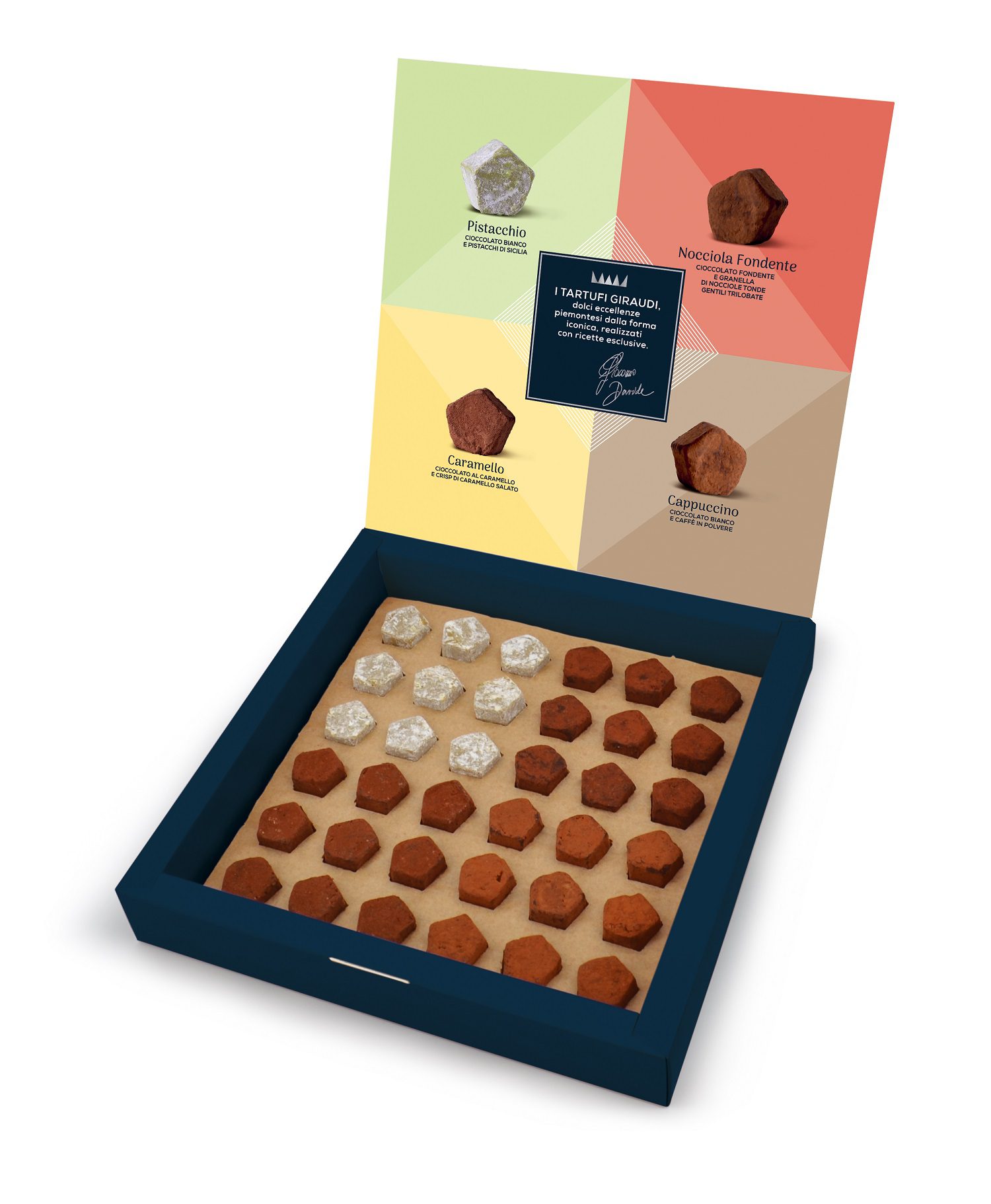 Seconda importante novità è la Confezione Regalo dedicata ai Tartufi, un prodotto della tradizione reinterpretato da Giraudi in una forma pentagonale in quattro gusti differenti: cioccolato fondente con Nocciola Piemonte, cioccolato bianco con pistacchi di Sicilia, cappuccino con cioccolato bianco e caffè e caramello, con cioccolato al caramello e crisp di caramello salato.
