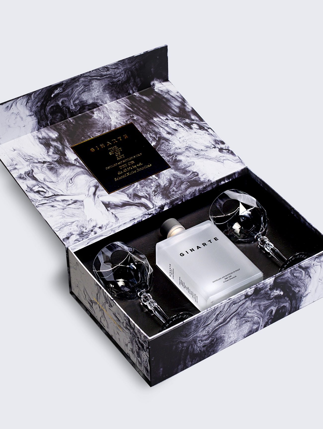 Indicato per chi ama il design, anche sotto l’albero, Ginarte si veste a festa con un’elegante box natalizia: assieme alla sua iconica bottiglia, custodisce due calici cocktail in cristallo ecologico, impreziositi da una boule finemente sfaccettata e da una base personalizzata con l’incisione Ginarte.