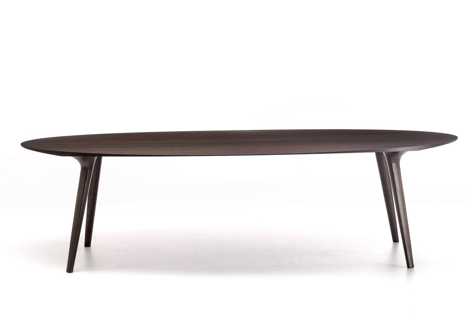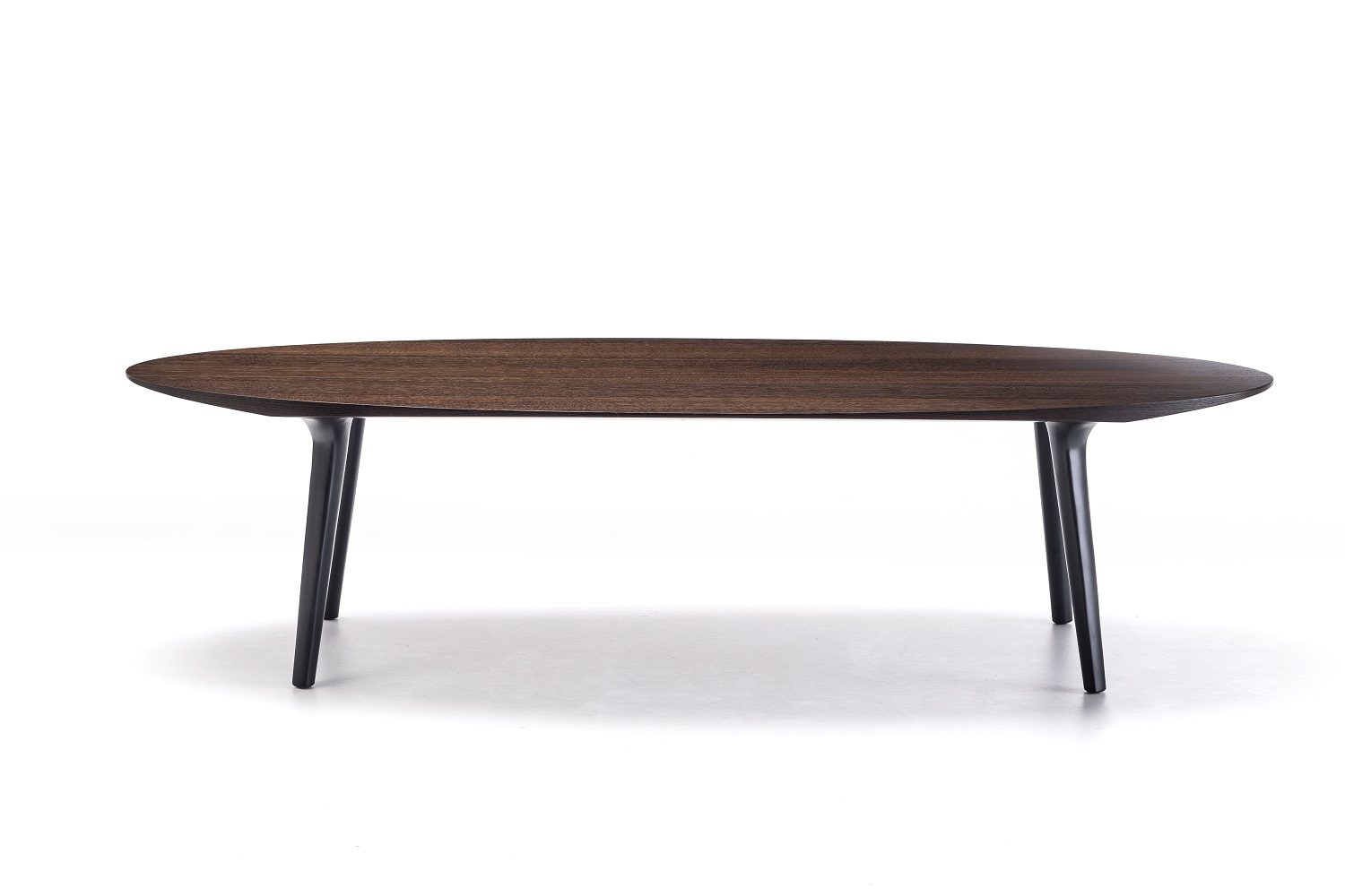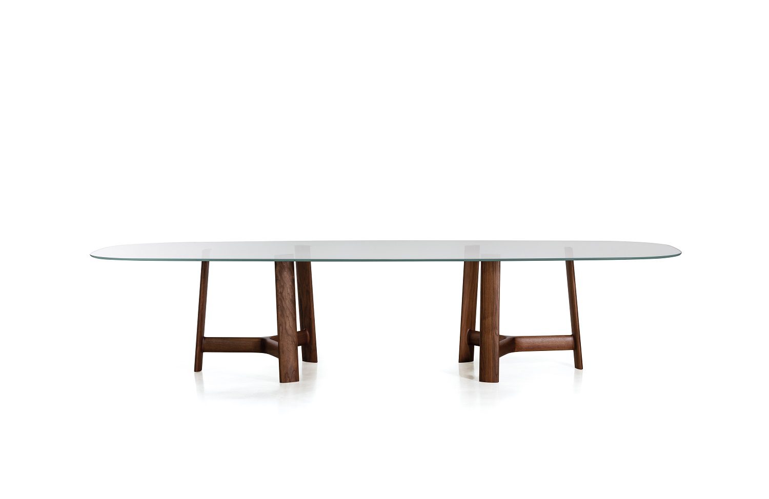 Anche nel tavolo River è l’elemento di base a definire il design. Marco Spatti progetta una collezione in cui la struttura è costituita da tre setti verticali in noce Canaletto o frassino massello a sezione ellittica e leggermente inclinati, uniti tra loro da traversi dalla sezione morbida, per dare origine a un’interpretazione del tradizionale ‘cavalletto’. Il piano può essere circolare o ovale, in differenti varianti dimensionali e opzioni materiche, tra cui anche cristallo e marmo.