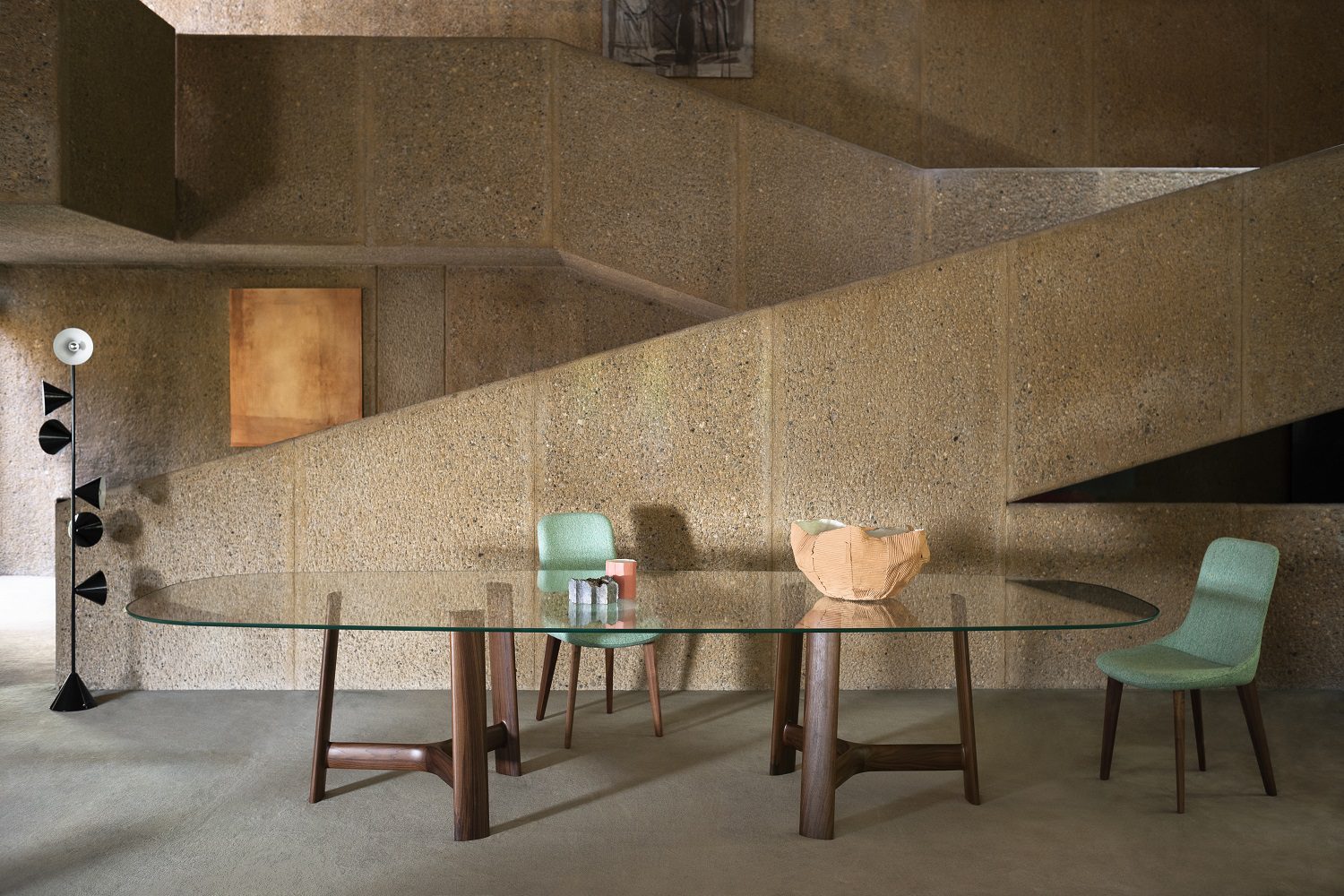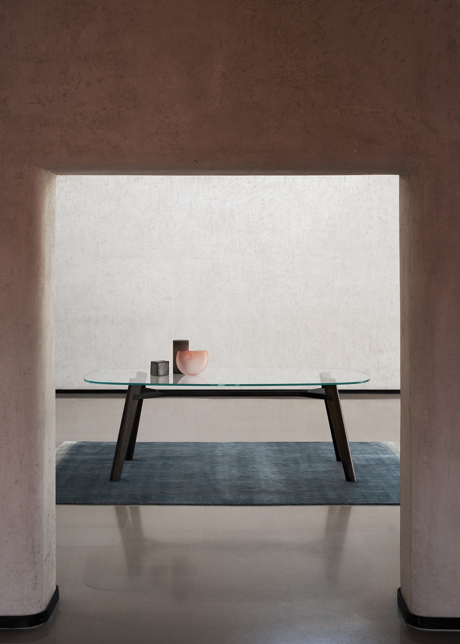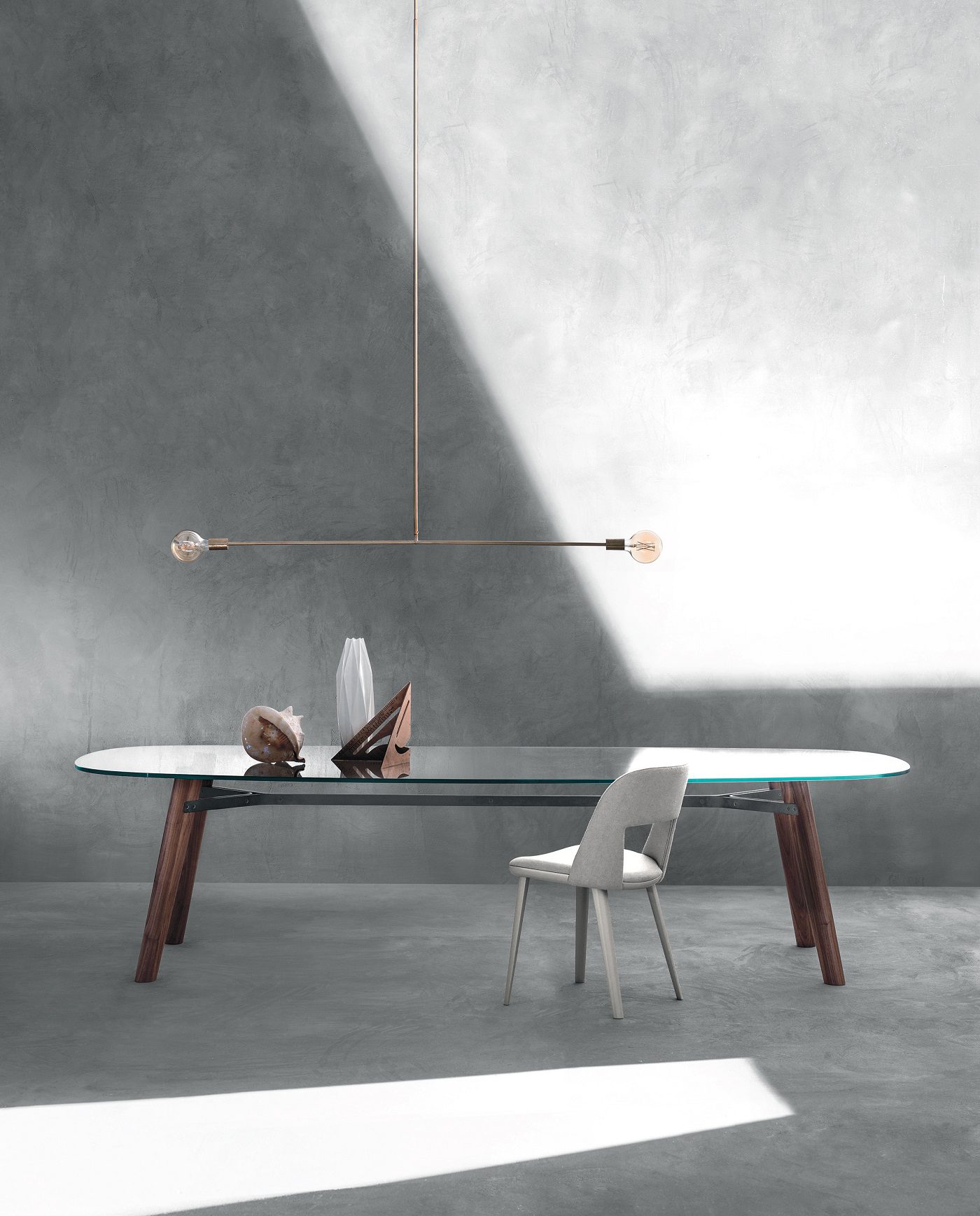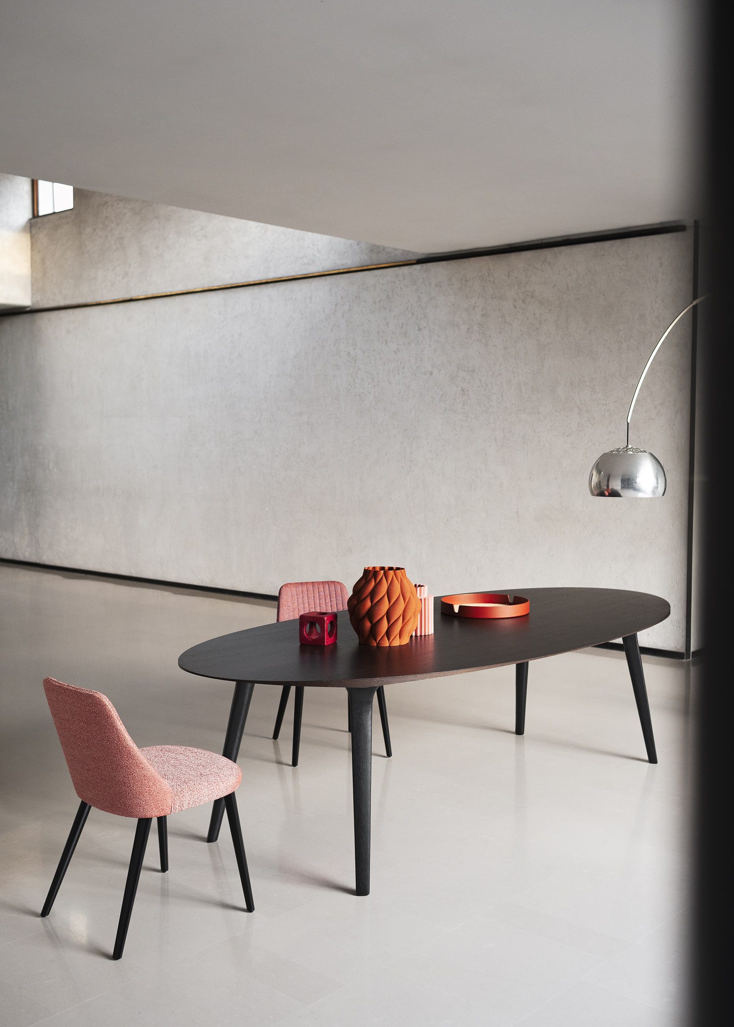 Le famiglie Beleos e Ademar nascono infine dalla collaborazione tra Bross e Giulio Iacchetti. La caratteristica identitaria della prima è data sempre dalla struttura, composta da due profili metallici disposti parallelamente che disegnano una Y alle estremità, a cui sono ancorate le gambe in massello di legno. Il top ovale, se scelto in cristallo, evidenzia l’elegante intelaiatura della base e i suoi minuziosi dettagli di incastro. Ademar, invece, affida al top la sua particolarità estetica: circolare o ellissoidale, in rovere o marmo, ha un profilo ad altezza variabile, che crea un sottile movimento lungo il bordo, mentre le gambe, inclinate e rastremate, lo sostengono secondo una logica di continuità progettuale.