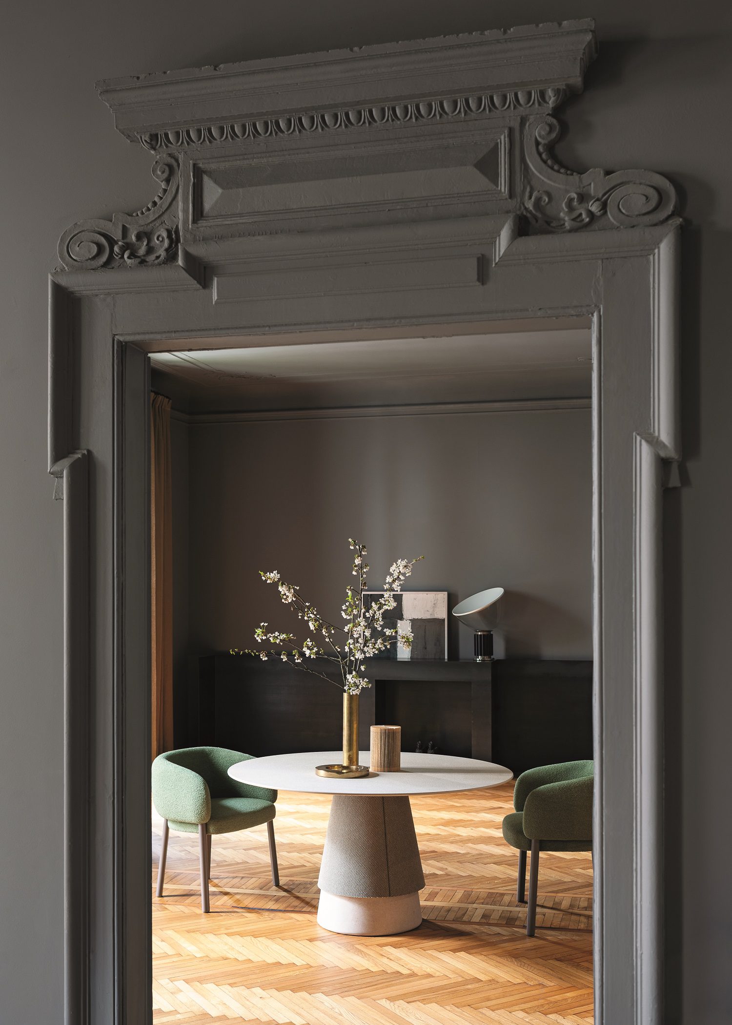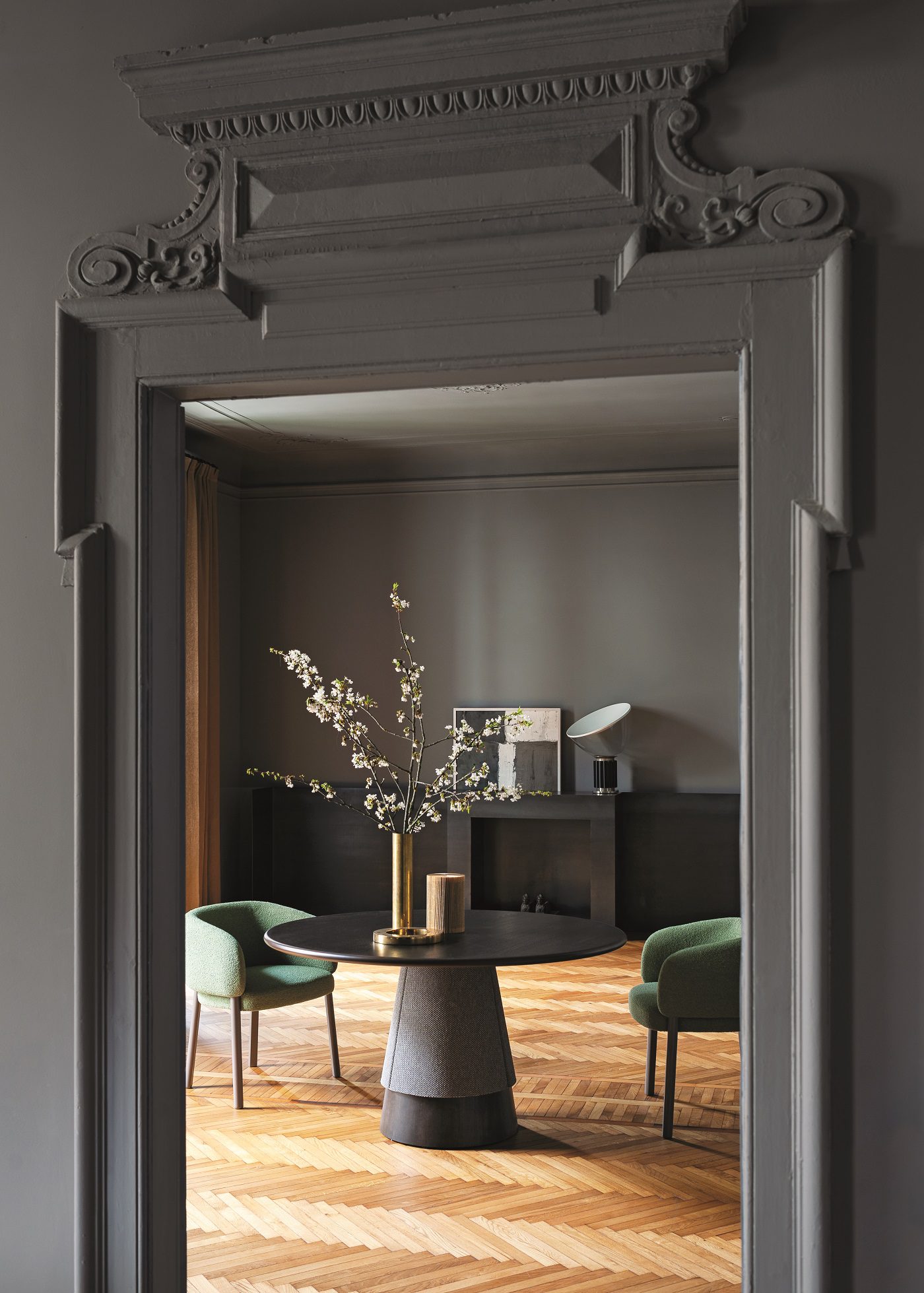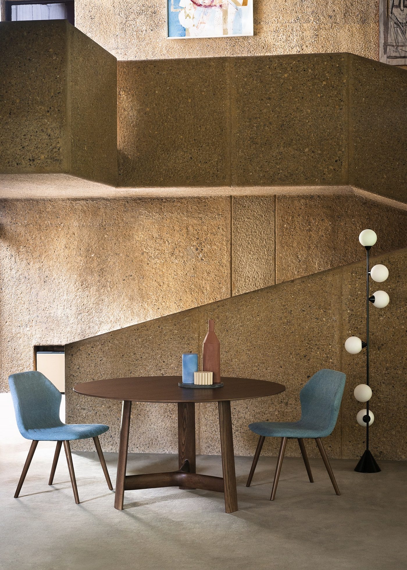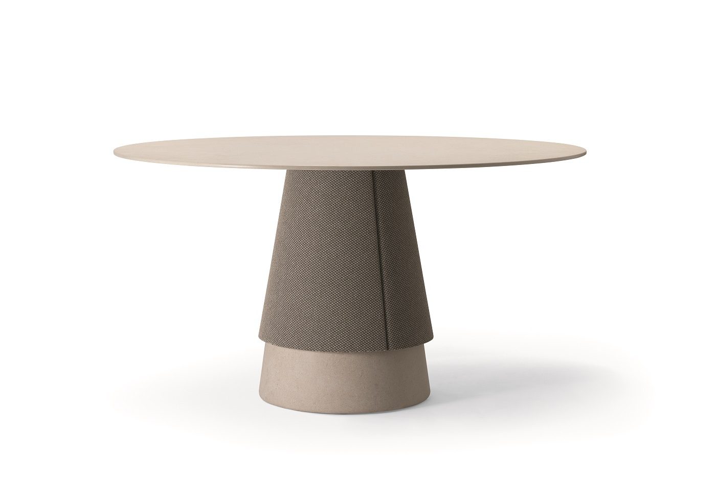 Aretha, disegnata da Monica Armani per Bross, è una composizione sofisticata di geometrie e finiture. La base è a colonna centrale, leggermente svasata, e risulta formata da due sezioni: una porzione di basamento – realizzato in frassino naturale, tinto o laccato o in diverse tipologie di pietra naturale -, e una rivestita da tessuto tecnico, disponibile in diverse nuance. Il top – con diametro di 140 o 160 cm – è coordinato con la struttura e ne riprende il linguaggio, attraverso il legno o ancora con una superficie in ceramica a tutta massa.