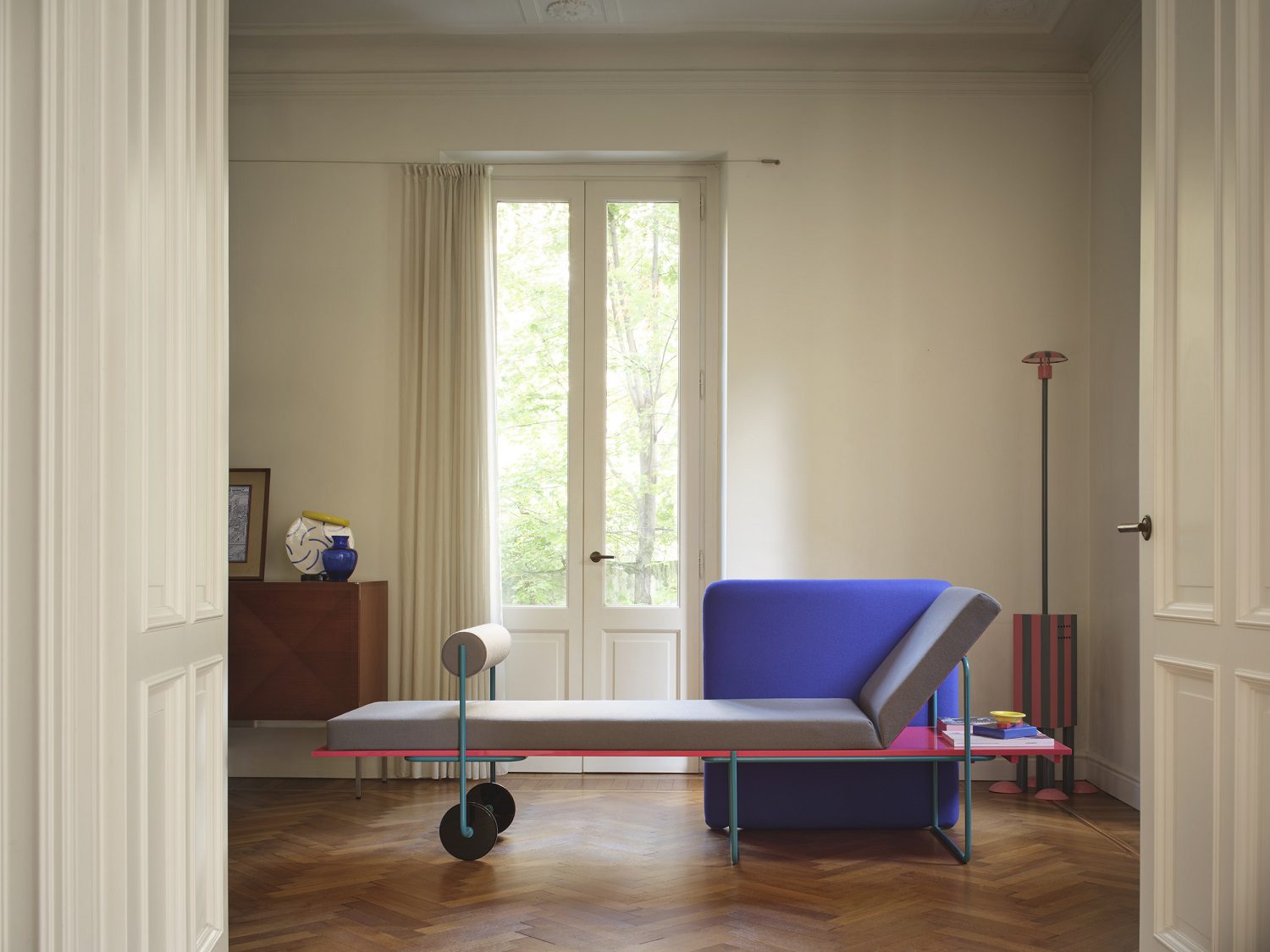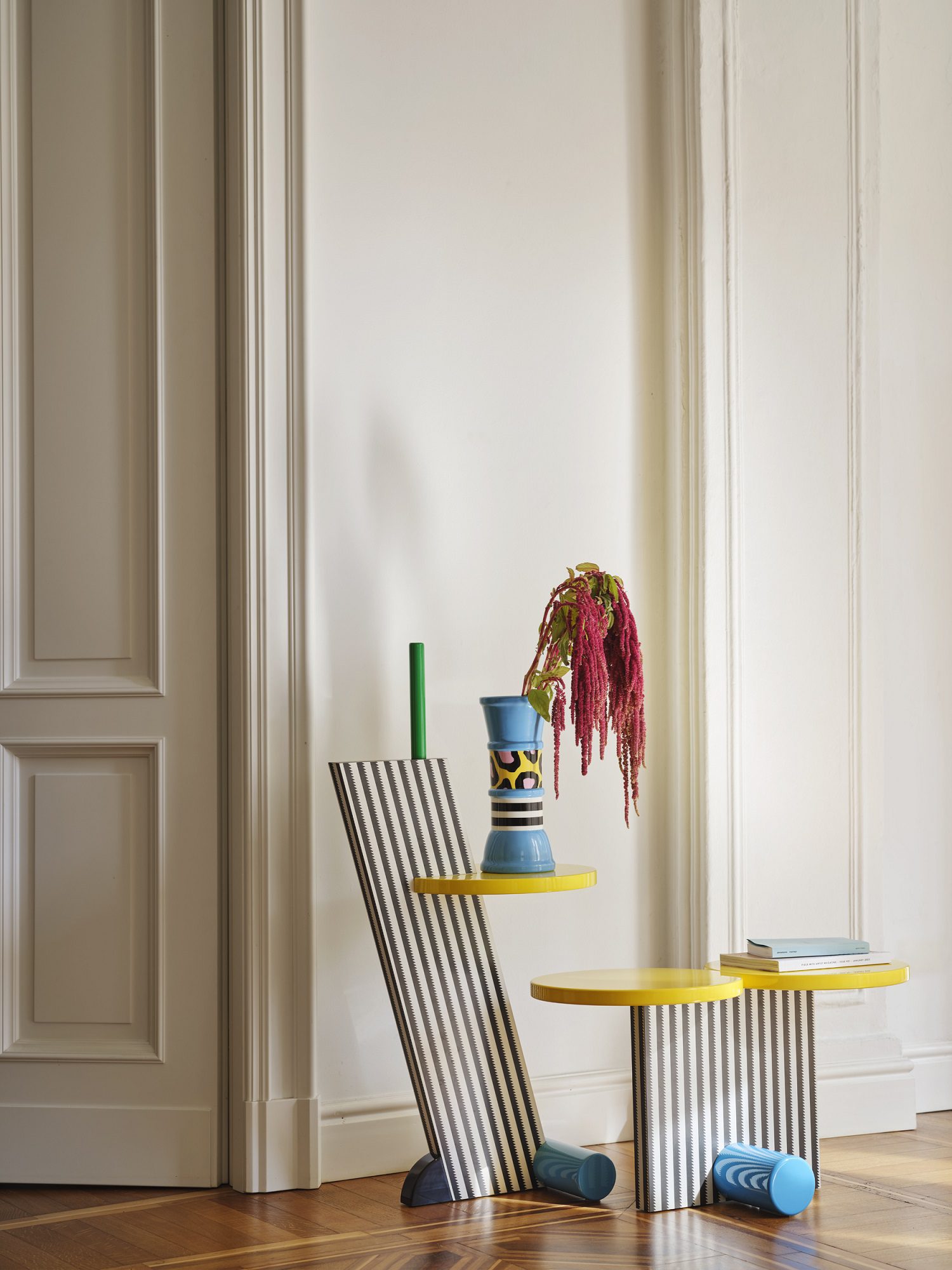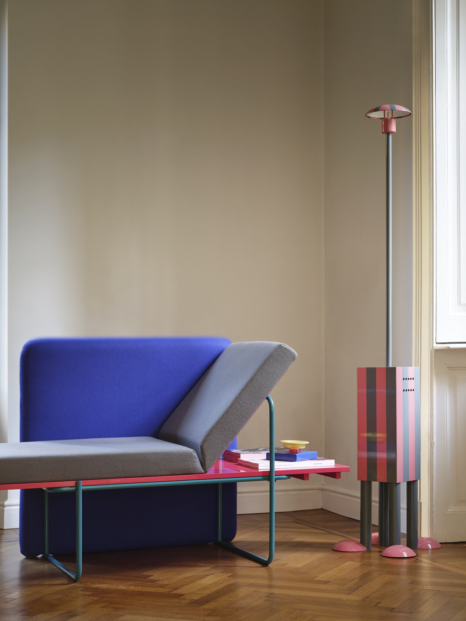 A sorvegliare questa scena teatrale pensano due presenze luminose di carattere opposto: da un lato la lampada da terra Terminus (Martine Bedin, 1981), un guardiano antropomorfo alto due metri che, con le sue zampette rosse e la struttura ad arco, sembra aver camminato fino al centro della stanza per osservarci; dall’altro la piccola Tahiti (Sottsass, 1981). Quella che appare come un’ironica “anatra” illuminante, con la testa policroma e la base tatuata dal pattern Bacterio, perde qui ogni connotazione di giocattolo provocatorio per rivelarsi un sofisticato compagno di lettura.