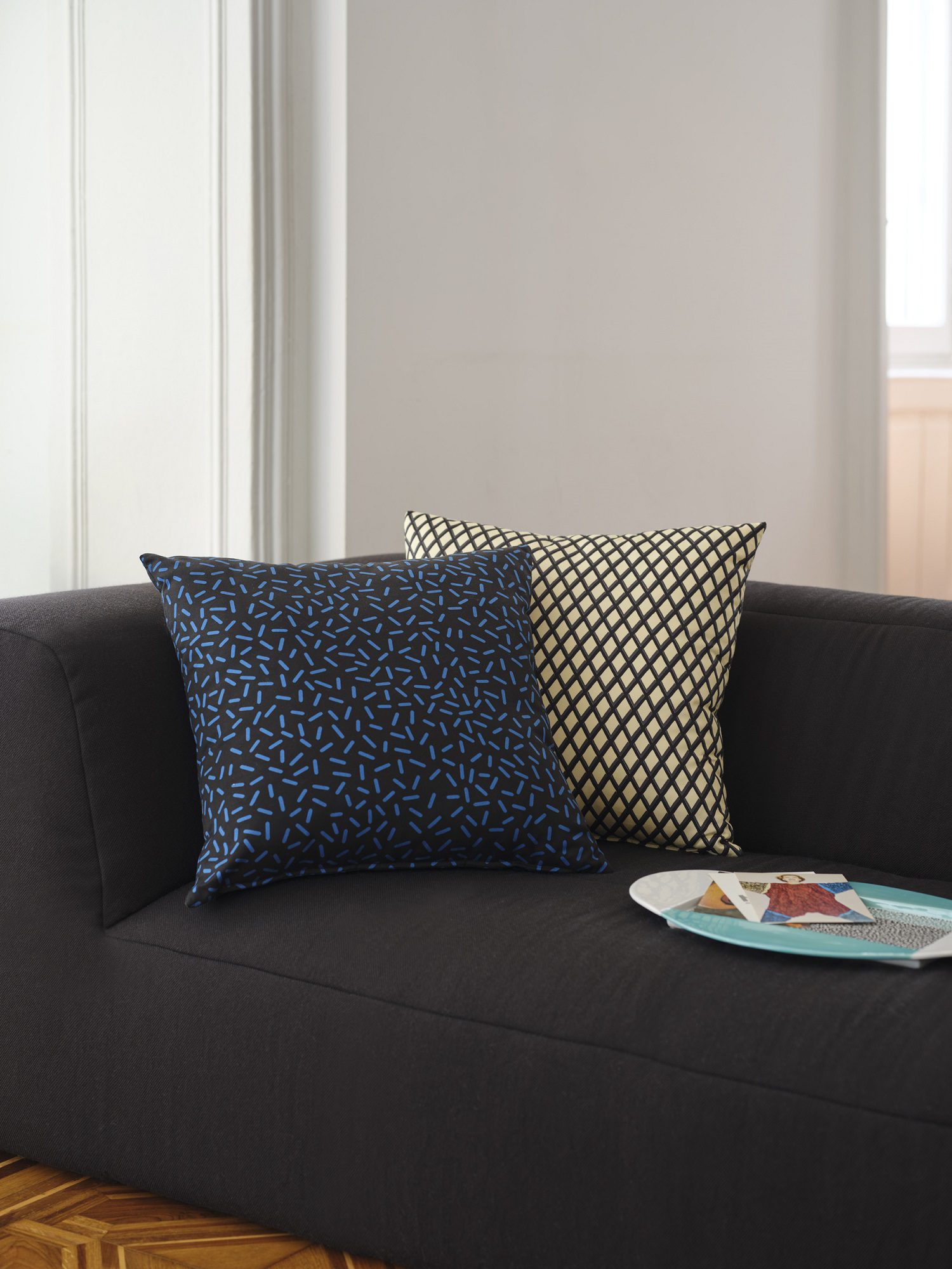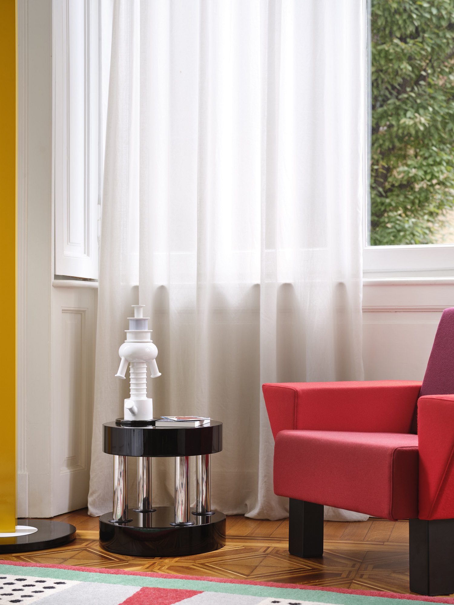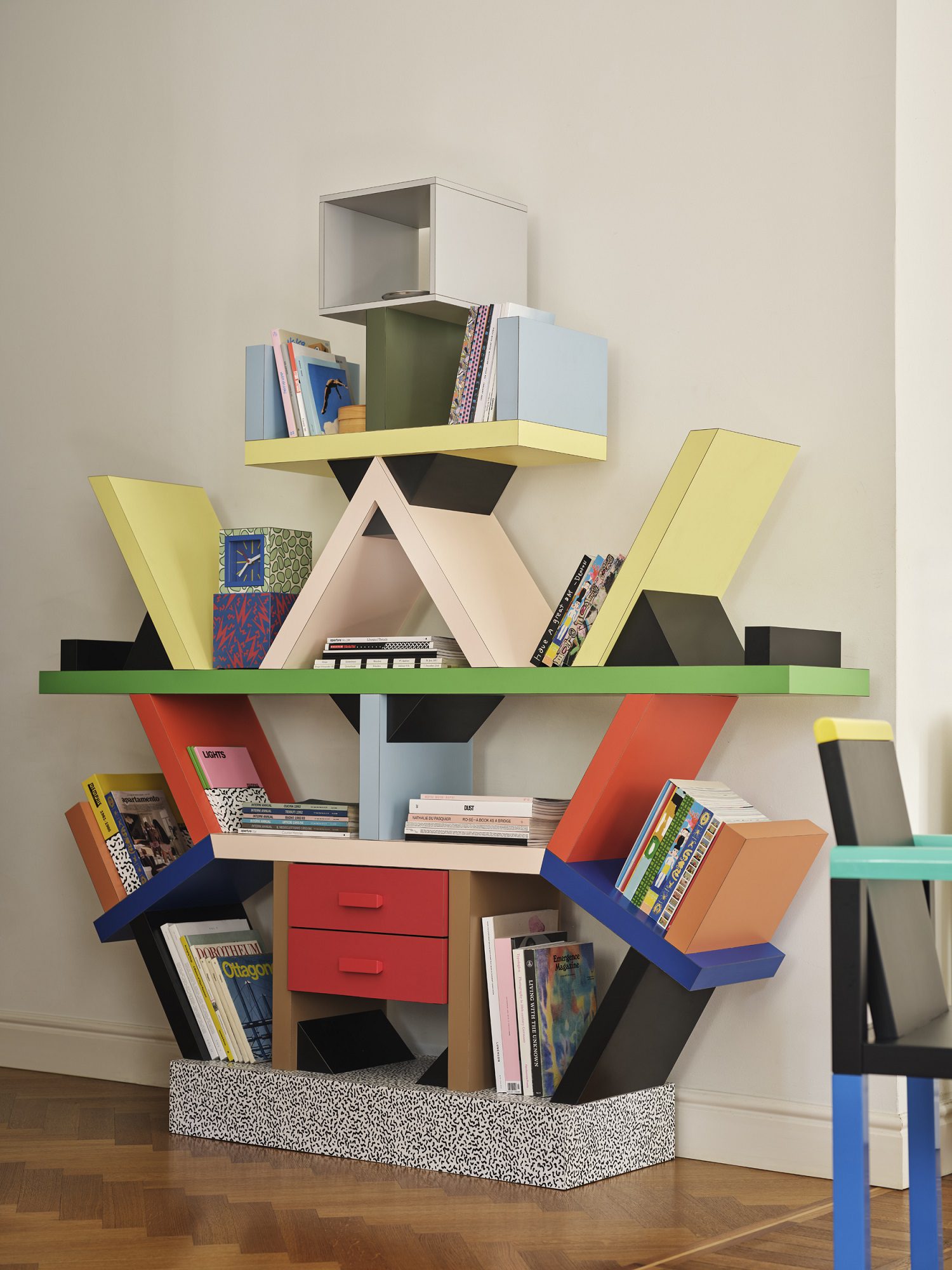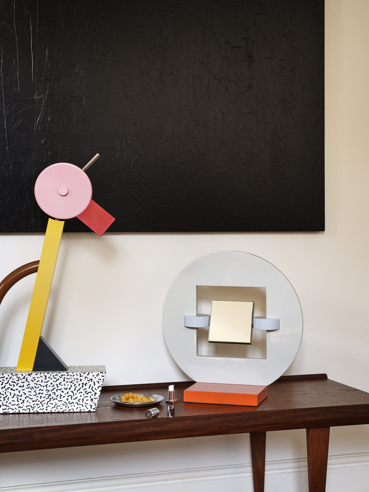 A sorvegliare questa scena teatrale pensano due presenze luminose di carattere opposto: da un lato la lampada da terra Terminus (Martine Bedin, 1981), un guardiano antropomorfo alto due metri che, con le sue zampette rosse e la struttura ad arco, sembra aver camminato fino al centro della stanza per osservarci; dall’altro la piccola Tahiti (Sottsass, 1981). Quella che appare come un’ironica “anatra” illuminante, con la testa policroma e la base tatuata dal pattern Bacterio, perde qui ogni connotazione di giocattolo provocatorio per rivelarsi un sofisticato compagno di lettura.