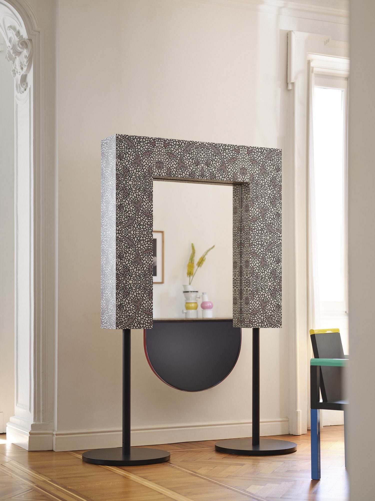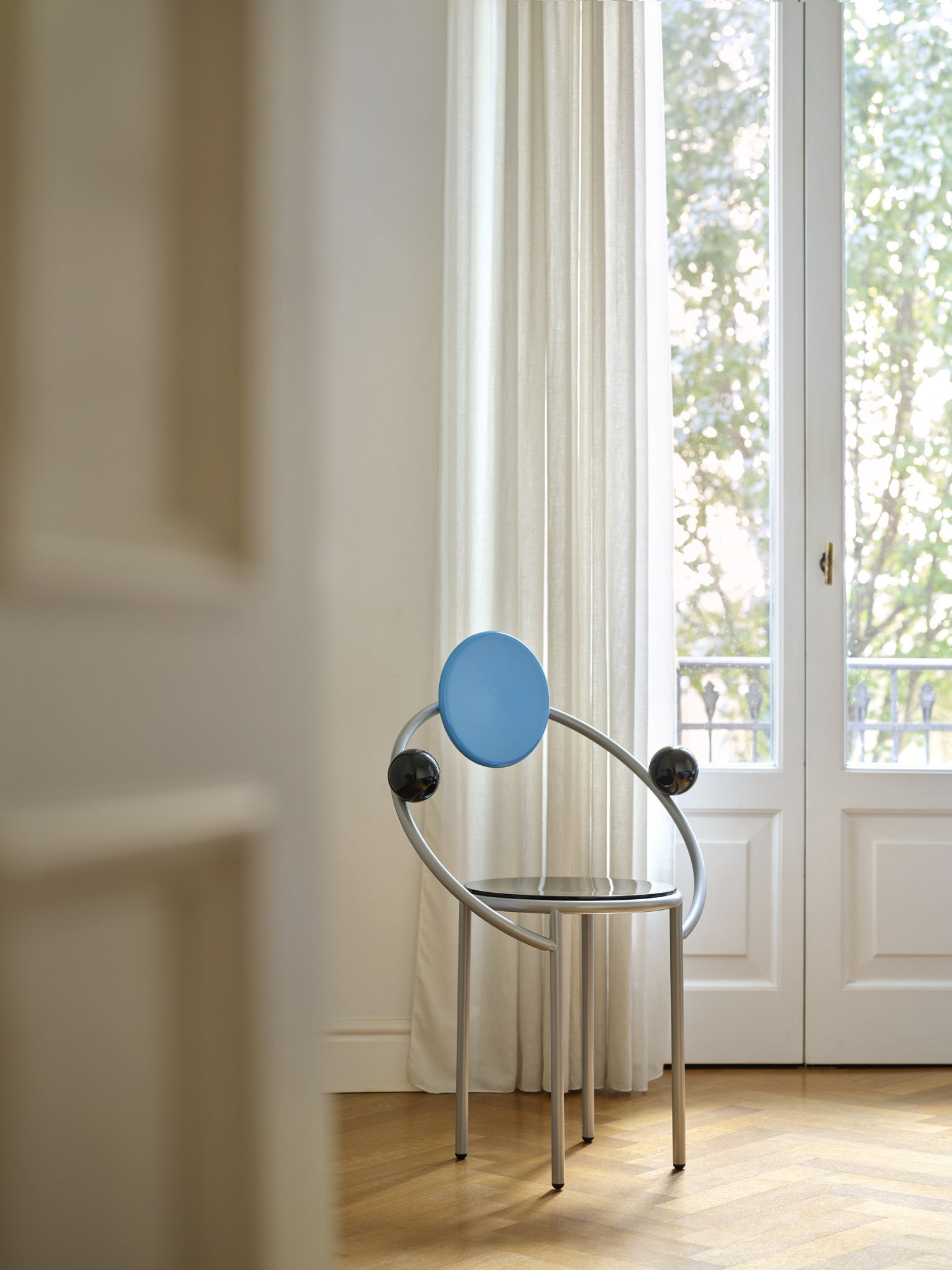 La dinamica dello spazio prosegue con la sedia First (Michele De Lucchi, 1983), che con il suo schienale orbitale e i braccioli sferici introduce un cinetismo spaziale in sala da pranzo, bilanciato dalla quiete riflessiva della Century (Andrea Branzi, 1982). Quest’ultima, vera isola di riposo “neoprimitiva”, ci ricorda attraverso la sua struttura rigida che accoglie la morbidezza come il comfort possa elevarsi a esperienza intellettuale.