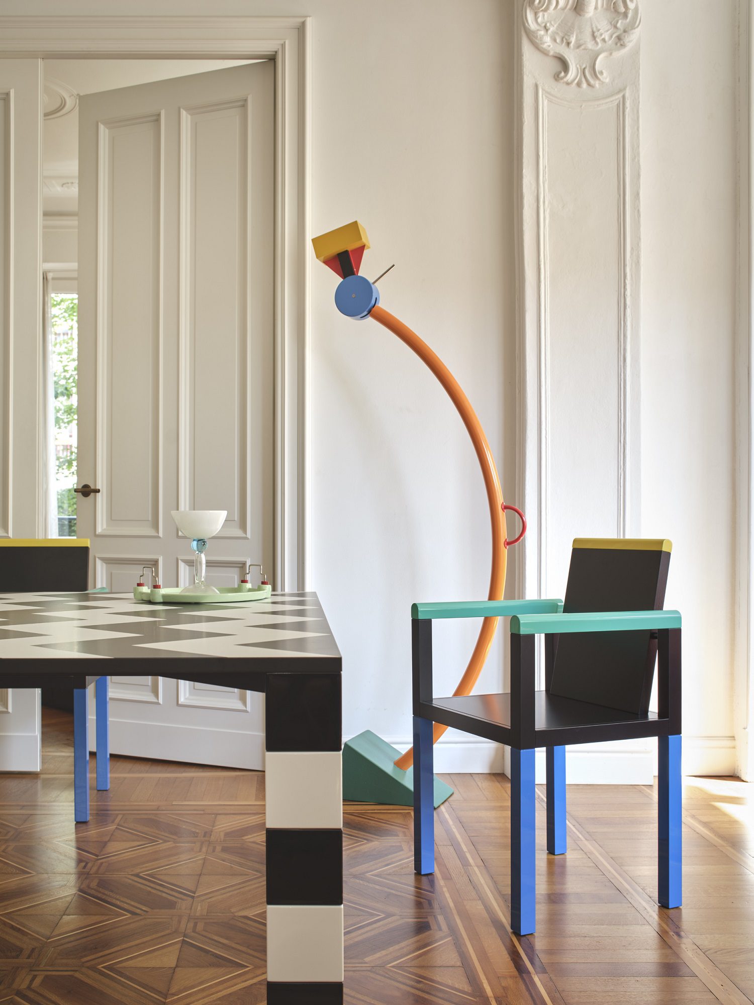La luce di Strada, morbida, laterale e pittorica, rivela la verità materica: la perfezione artificiale e lucida delle superfici Memphis contro la naturalezza imperfetta dell’intonaco storico e delle modanature in gesso. È un dialogo tra due nobiltà: quella della storia architettonica e quella dell’industria creativa radicale.