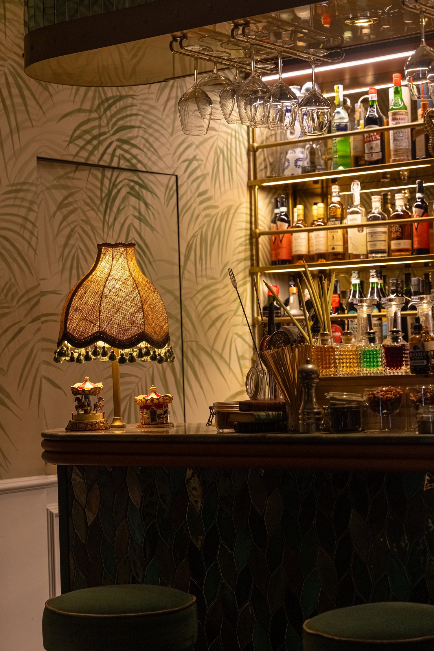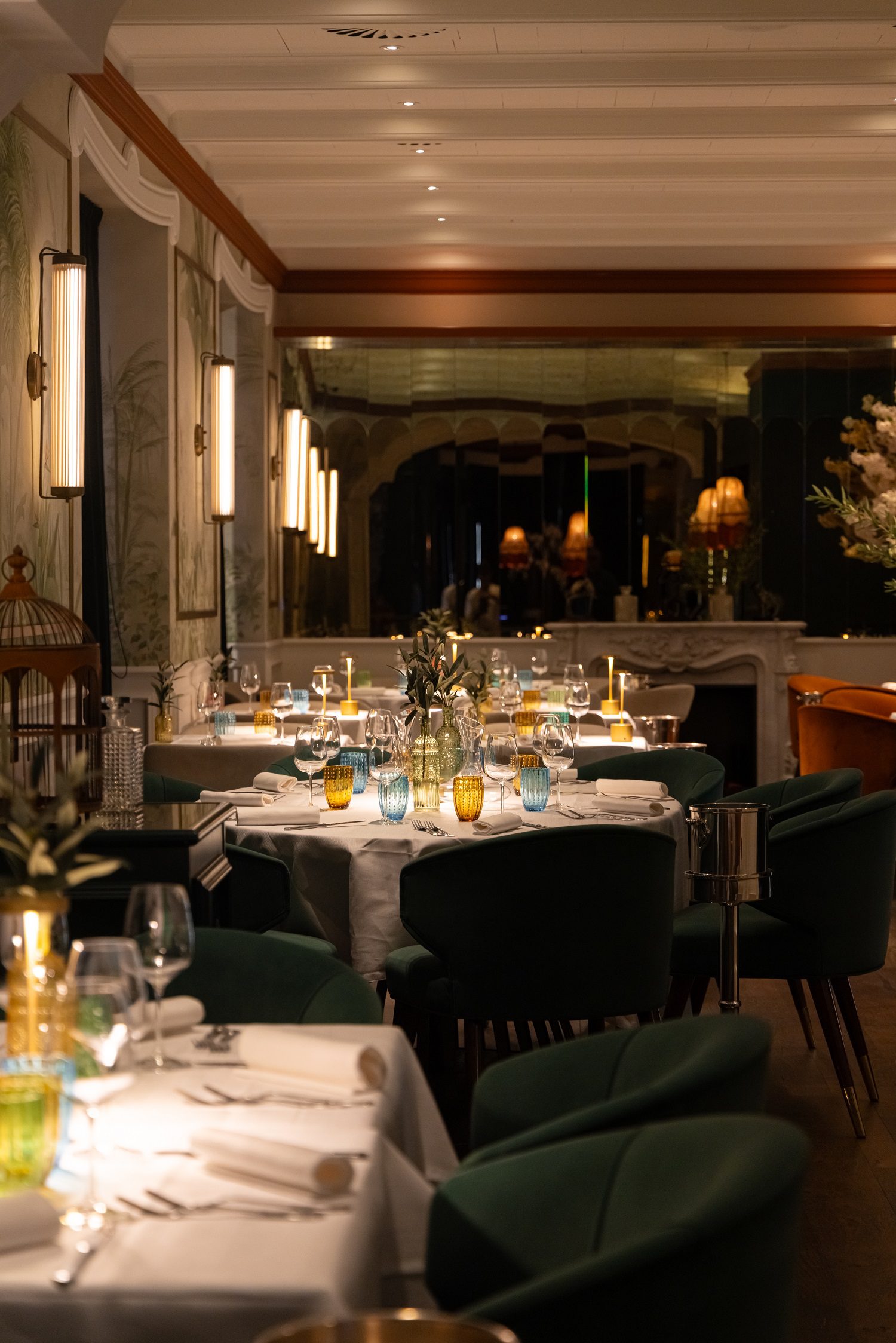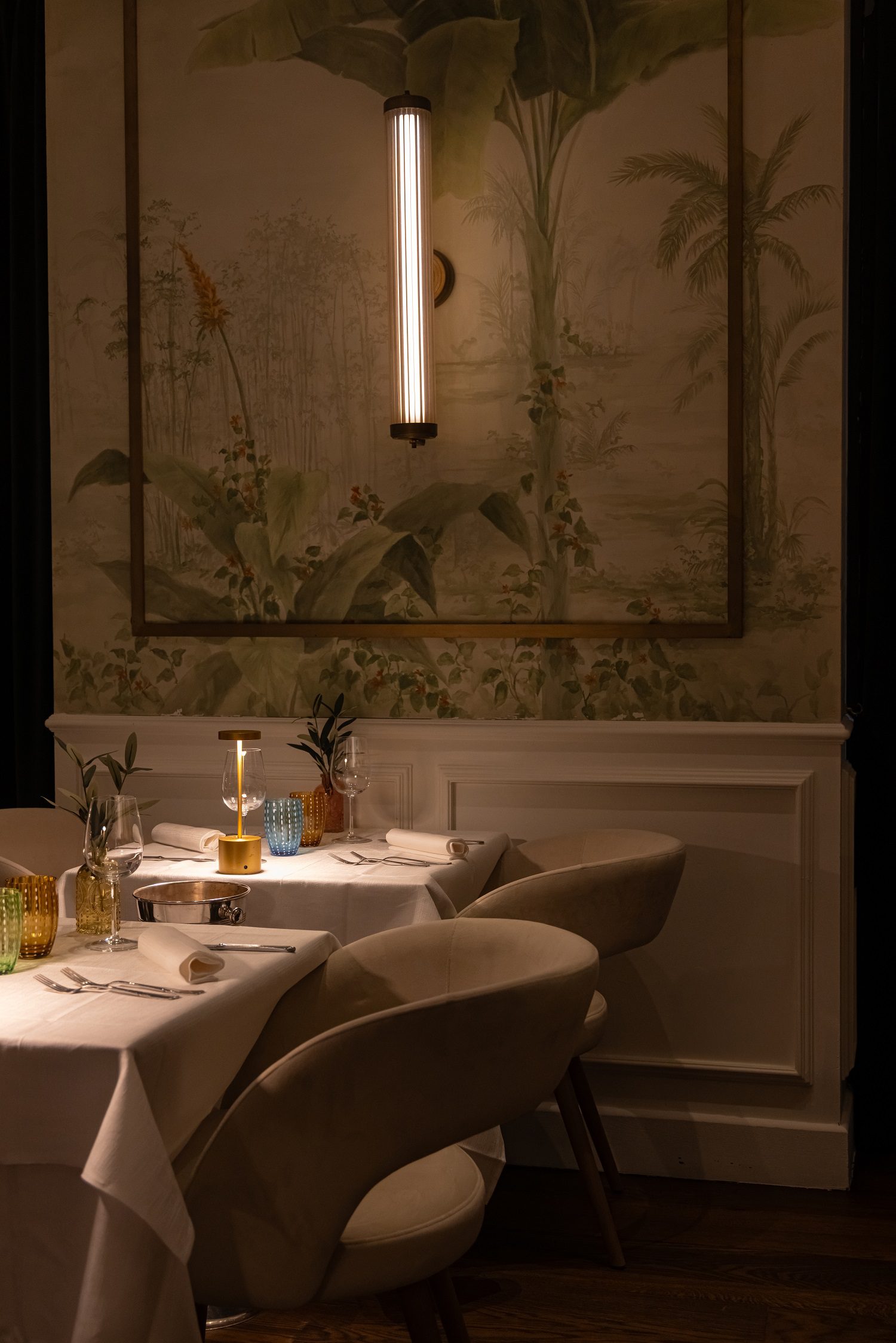 Gli interni evocano la grazia delle sale da pranzo borghesi di un tempo, reinterpretata in chiave intima e moderna. Il progetto gioca su una palette di verde salvia, corallo e ottone brunito, con velluti, boiserie e lampade rétro che diffondono una luce morbida e avvolgente. Ogni elemento è pensato per favorire la permanenza: i tavoli ben distanziati, i fiori freschi su ogni mise en place, la luce che cade sui calici e disegna riflessi caldi sul legno dei pavimenti. Le decorazioni murali ispirate ai giardini esotici, gli archi bianchi e i tendaggi scuri creano una dimensione raccolta e sofisticata.