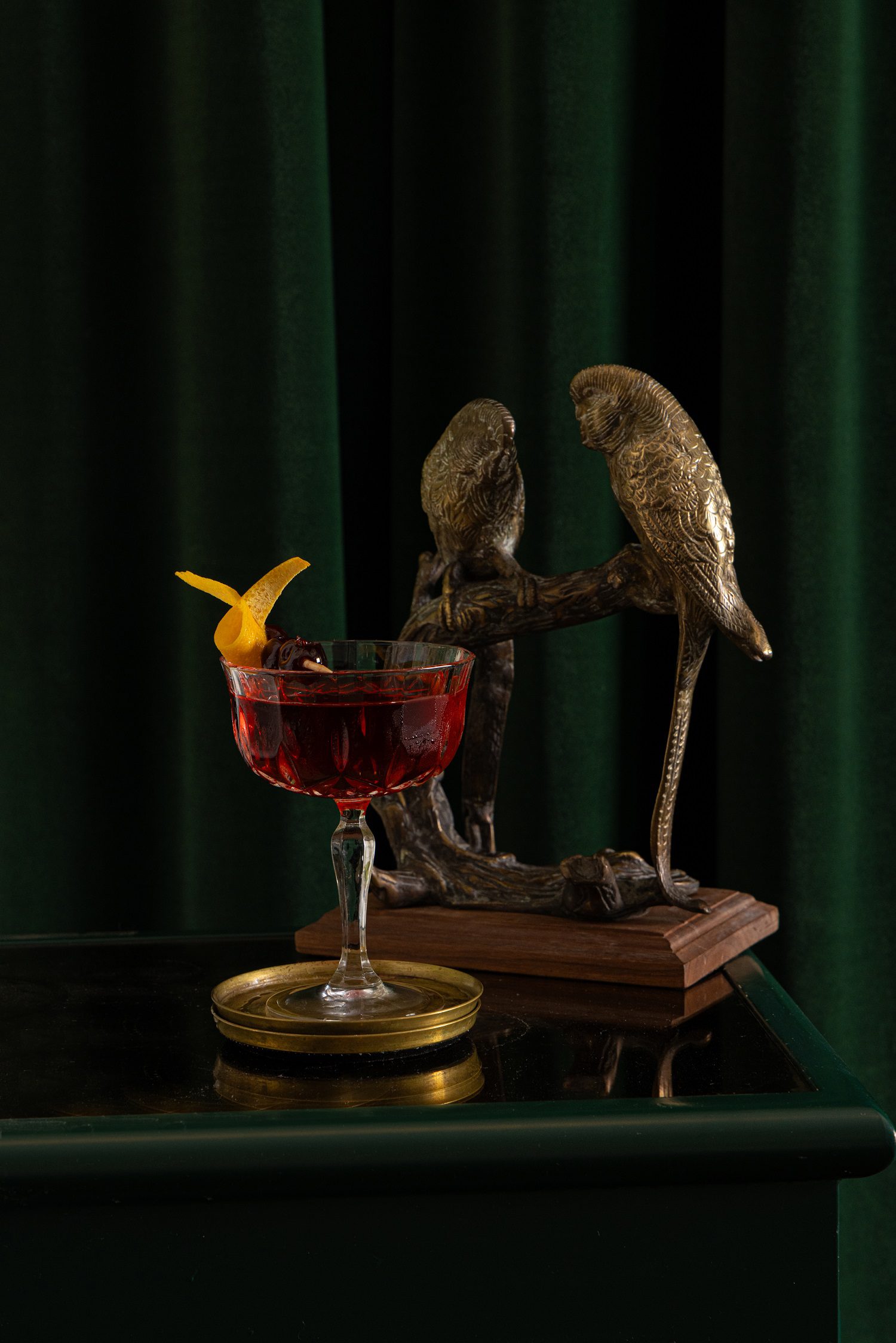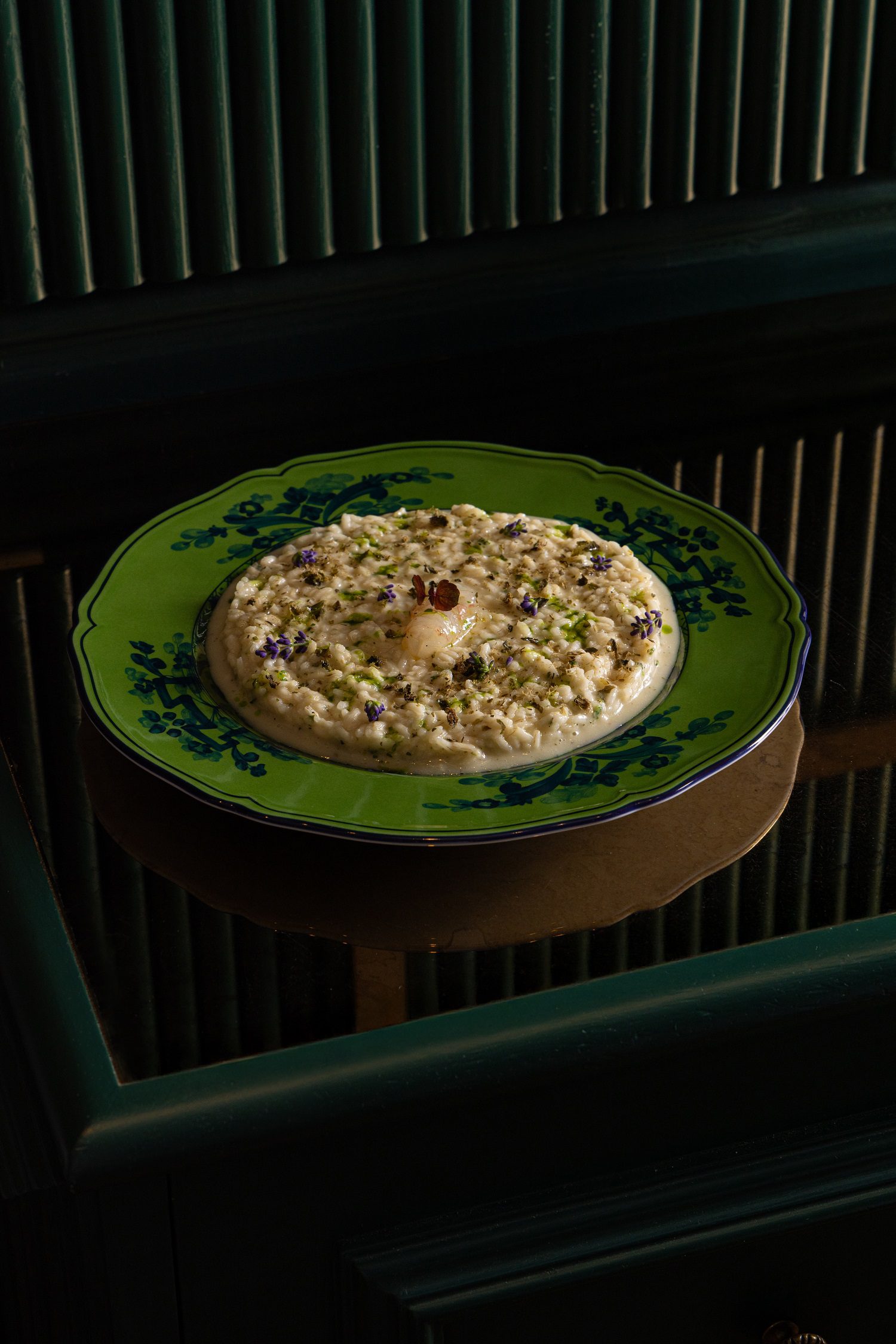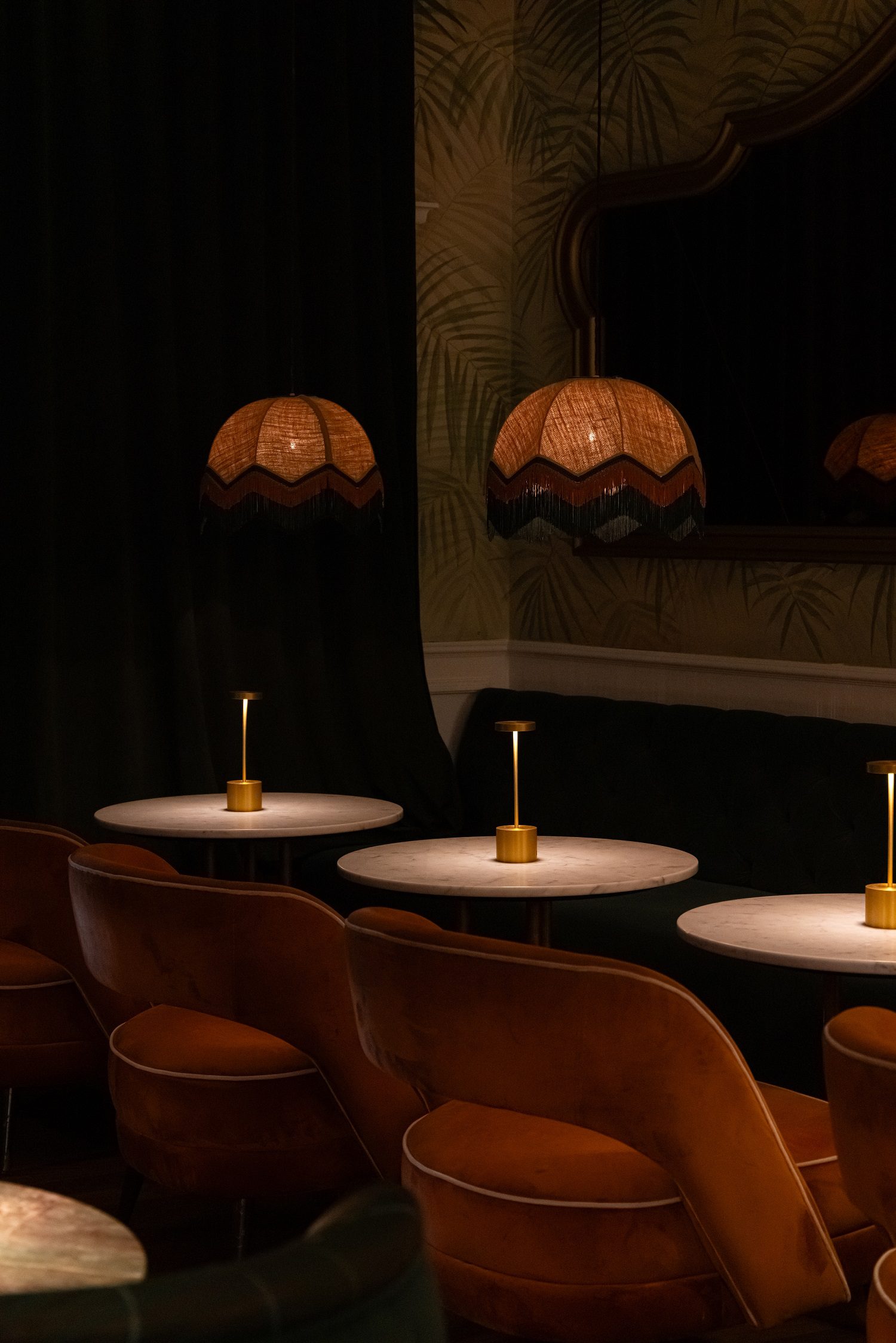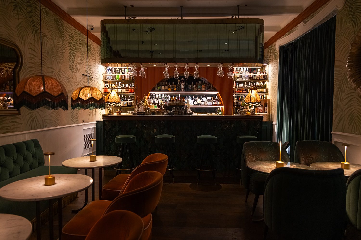 Gli interni evocano la grazia delle sale da pranzo borghesi di un tempo, reinterpretata in chiave intima e moderna. Il progetto gioca su una palette di verde salvia, corallo e ottone brunito, con velluti, boiserie e lampade rétro che diffondono una luce morbida e avvolgente. Ogni elemento è pensato per favorire la permanenza: i tavoli ben distanziati, i fiori freschi su ogni mise en place, la luce che cade sui calici e disegna riflessi caldi sul legno dei pavimenti. Le decorazioni murali ispirate ai giardini esotici, gli archi bianchi e i tendaggi scuri creano una dimensione raccolta e sofisticata.