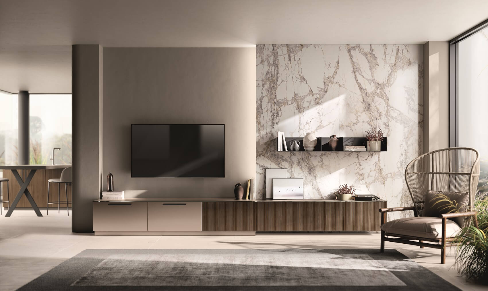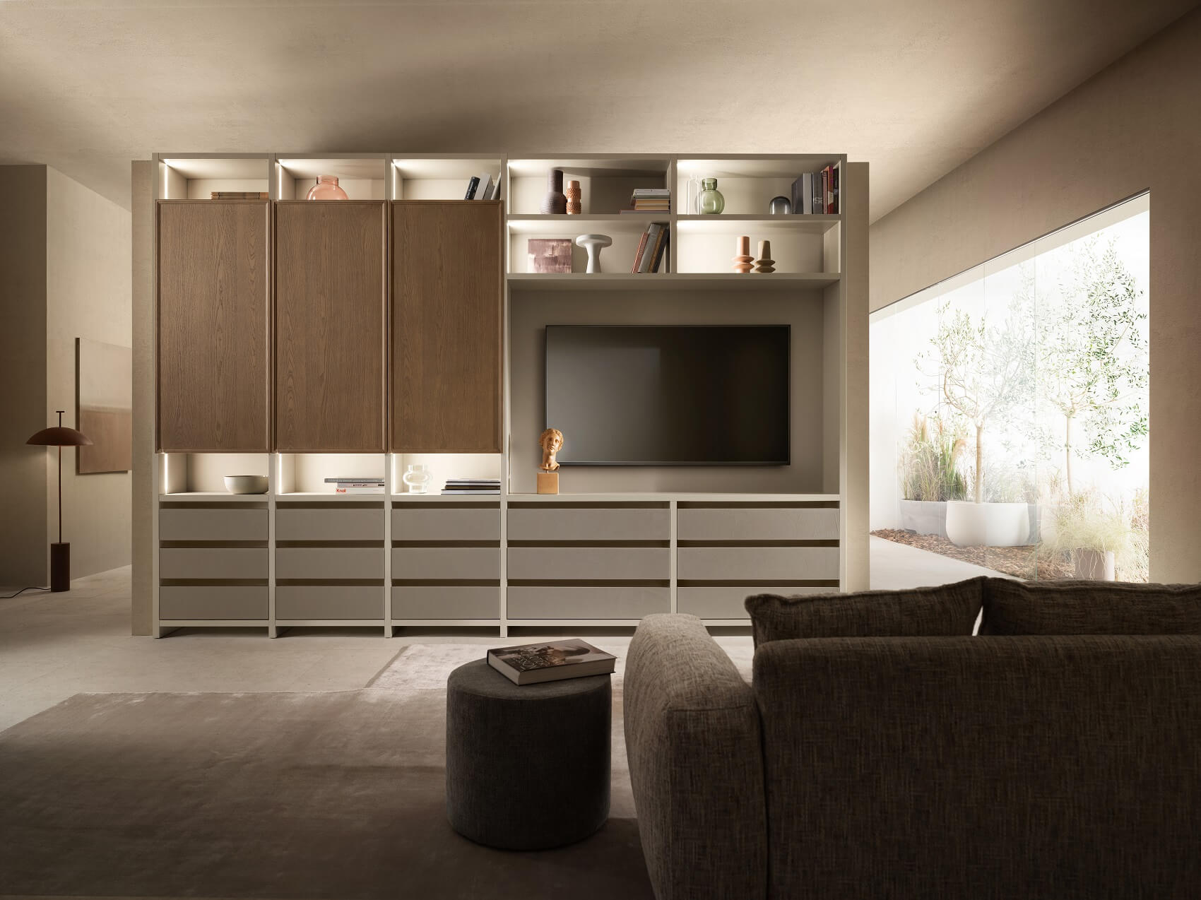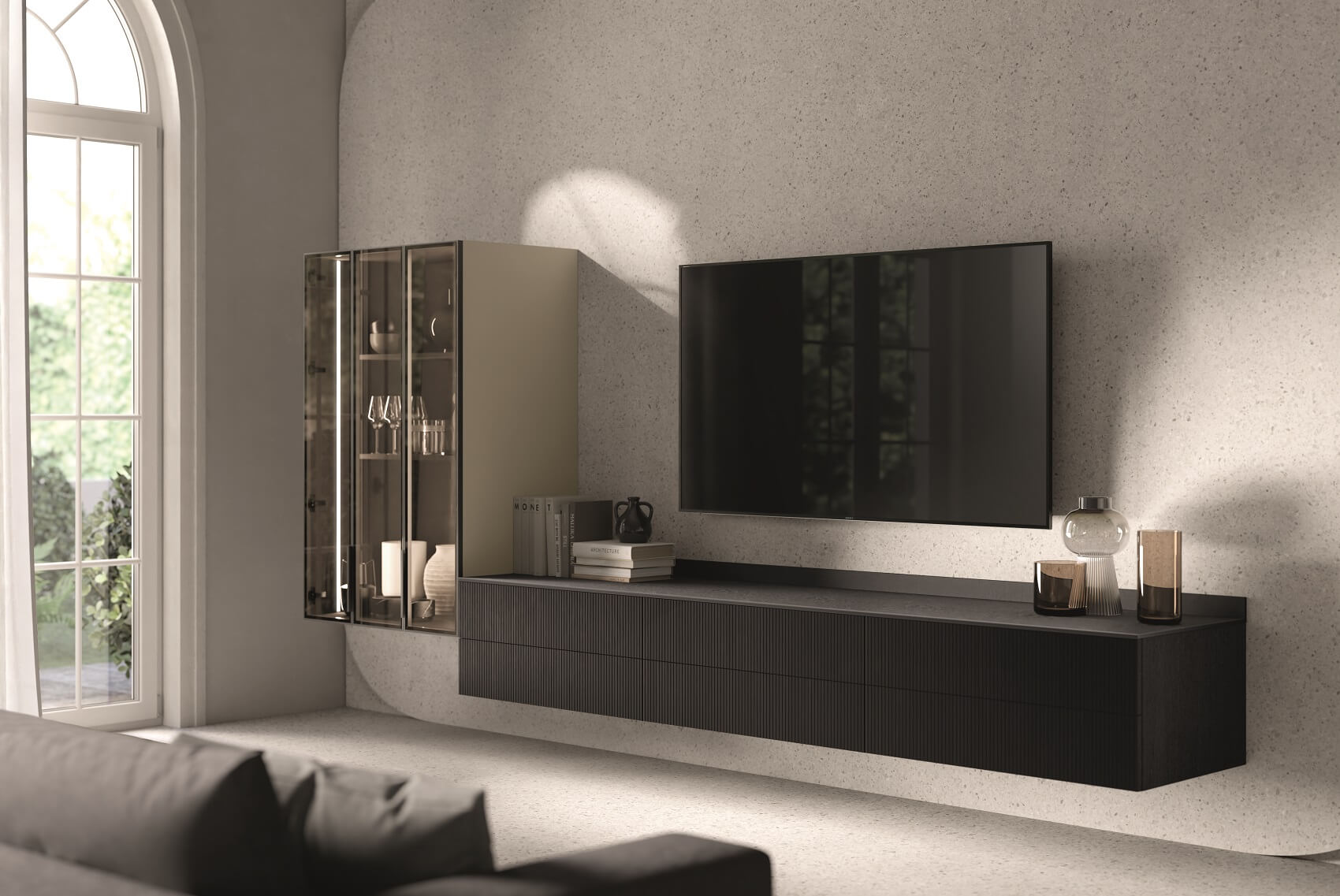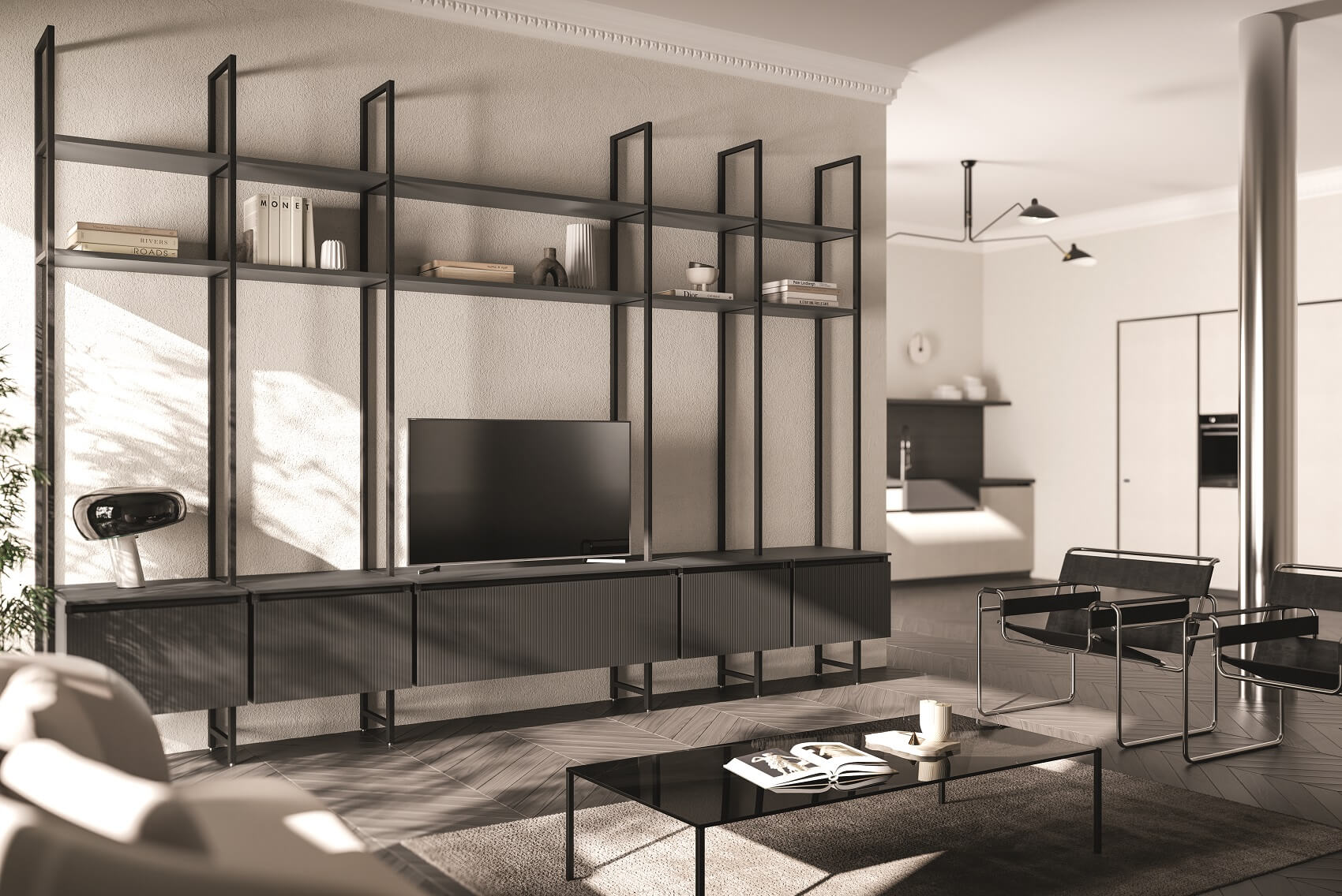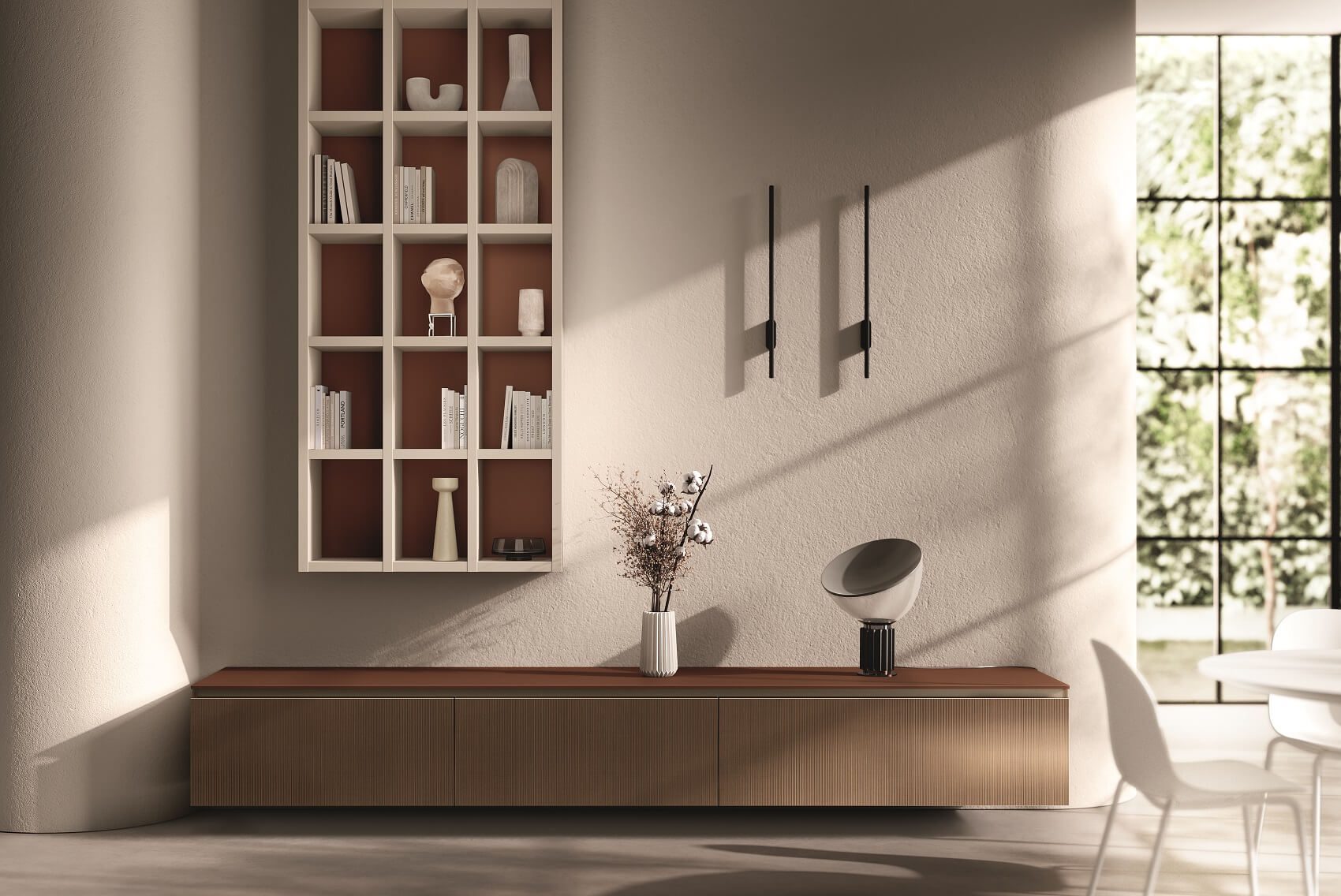 Il Sistema Parete Fluida, insieme alla varietà di moduli ed elementi disponibili (basi, pensili, librerie, armadi, schienali TV, mensole e piani d’appoggio), consente di progettare soluzioni living su misura, anche per spazi ridotti, inclusi angoli studio o lavoro integrati.