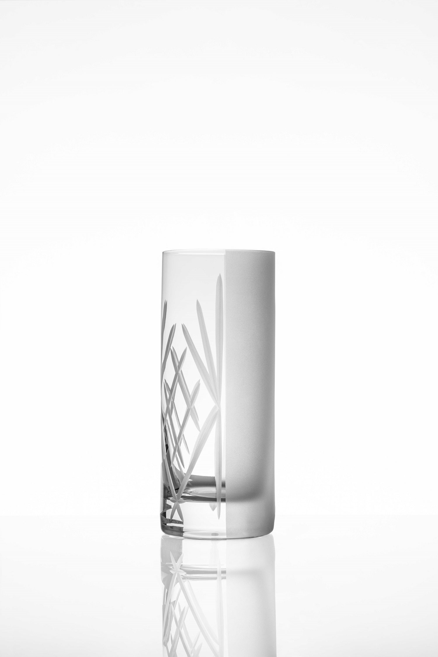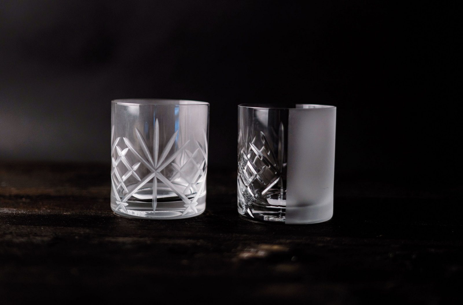 Tra le collezioni presentate al Remedy, In/Tagli è un omaggio alla tradizione della molatura reinterpretata in chiave contemporanea. Il contrasto tra la metà sabbiata e quella lavorata dona al vetro un effetto di profondo fascino visivo e mistero, in sintonia con l’atmosfera sofisticata del locale. Il gioco di luci e ombre tra contenitore e contenuto rende ogni bicchiere un oggetto scenico, capace di raccontare e valorizzare ciò che contiene.