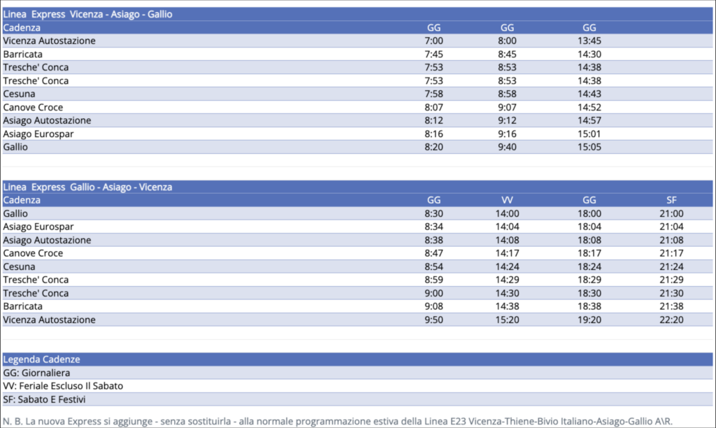 Questi ultimi, infatti, partendo da Vicenza alle 7.00 oppure alle 8.00 possono arrivare in Altopiano a inizio mattinata, dunque con un’intera giornata a disposizione. Anche per il ritorno è prevista un’ampia scelta di orari, con la possibilità il sabato e la domenica di fermarsi in Altopiano fino alle prime luci della sera, prendendo l’ultima corsa delle 21.00 da Gallio con arrivo a Vicenza alle 22.20.
