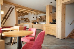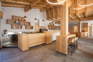 Il secondo step di lavori nella primavera scorsa: è stato effettuato il consistente lavoro di sabbiatura del fabbricato (sul legno) sia degli interni sia degli esterni; poi l’aggiunta dell’arredo, i nuovi serramenti, il lavoro sull’isolamento esterno, e la realizzazione della scala di sicurezza della cucina. Importante anche il lavoro di rivisitazione degli spazi a piano terra del noleggio: sono stati realizzati più spazi per permettere la convivenza del noleggio degli sci e delle biciclette. A questo si aggiunge un ufficio e un locale per il personale di servizio.